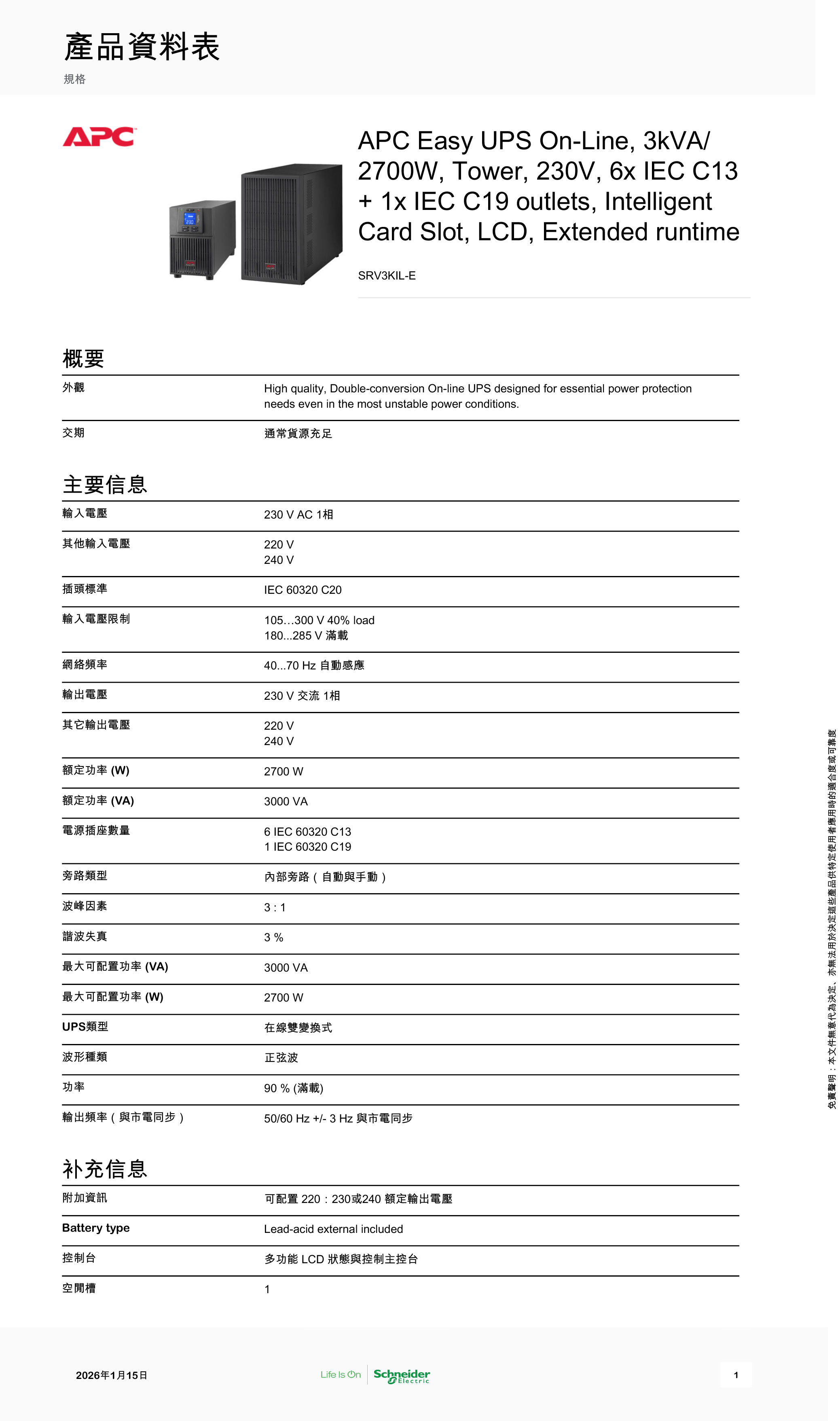 昌運監視器 APC SRV3KIL-E 2700W 230V 在線式 純弦波塔式 UPS不斷電系統