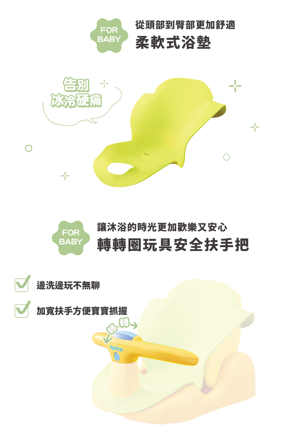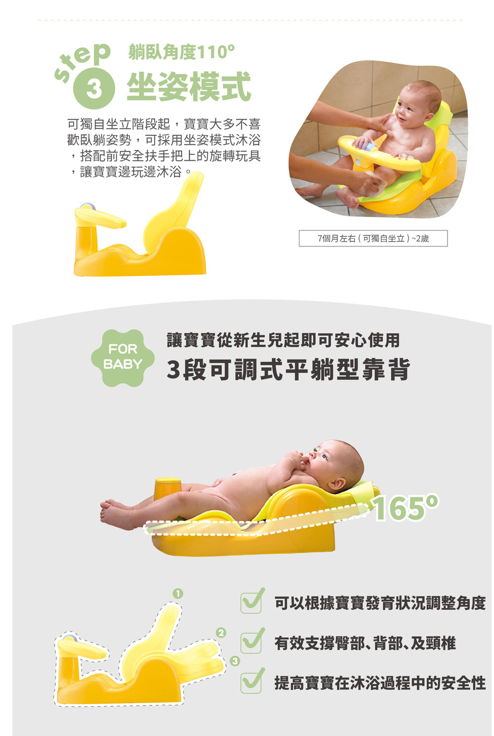 椅背具有3段可調式躺臥功能,讓寶寶從新生兒起即可安心使用。配備柔軟式浴墊與多功能的變化,讓寶寶不再討厭洗澡,增加沐浴時親子的歡樂時光。
