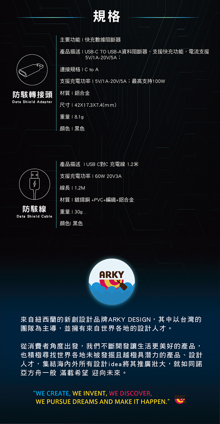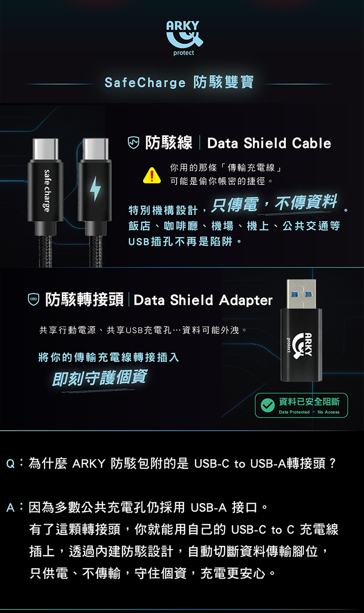 ARKY SafeCharge 防駭雙寶 USB-C to A 防駭轉接頭 + Type-C 防駭充電線 (60W快充)