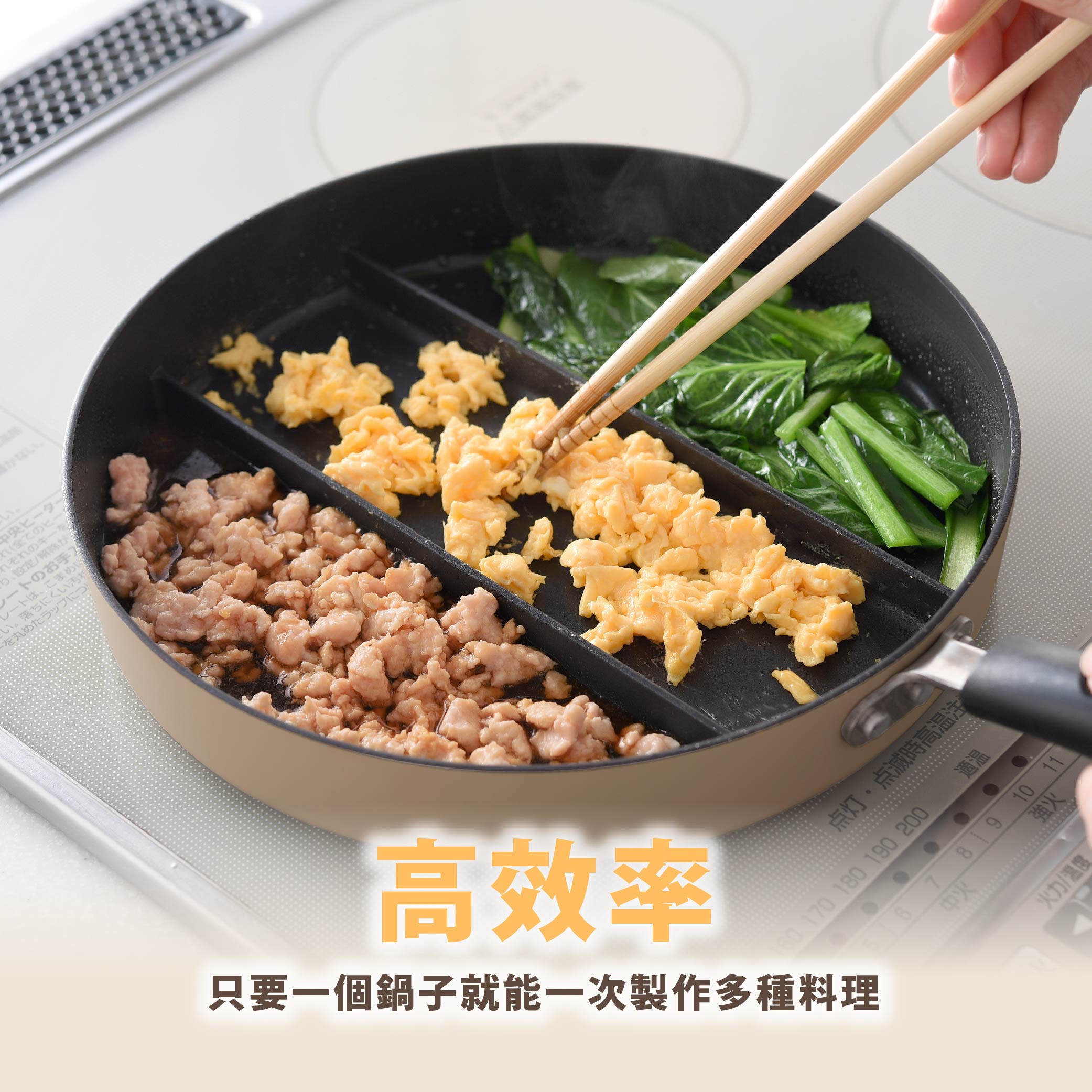 三格分隔設計,可同時煎蛋、香腸、配菜,早餐或便當一次完成,大幅縮短料理時間。