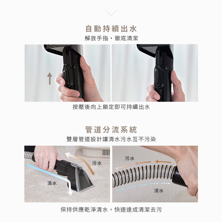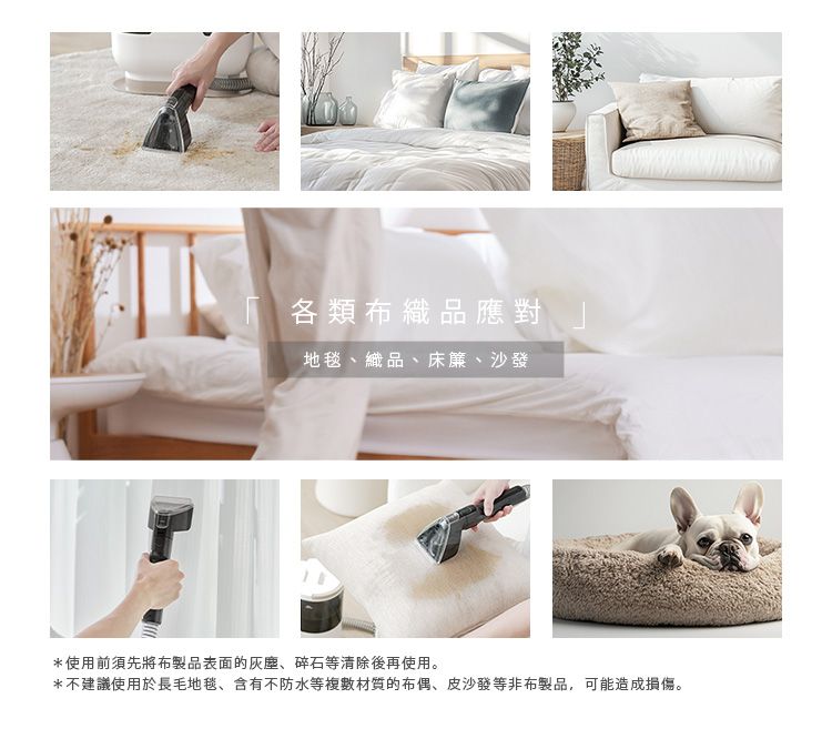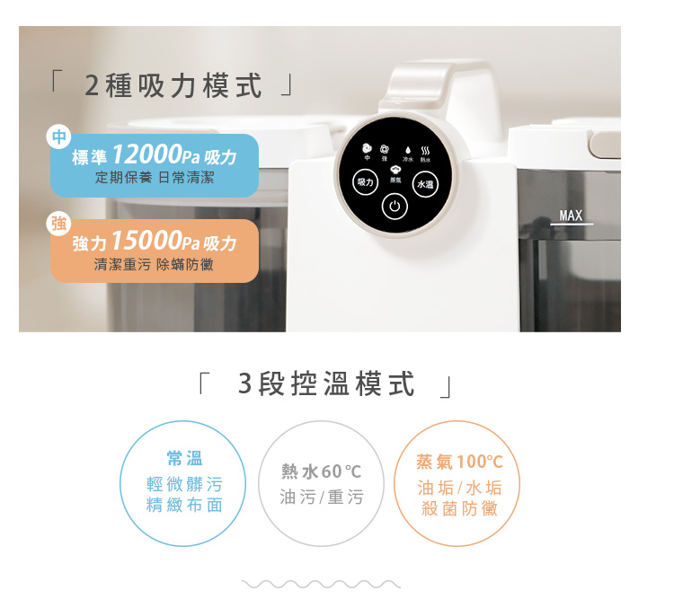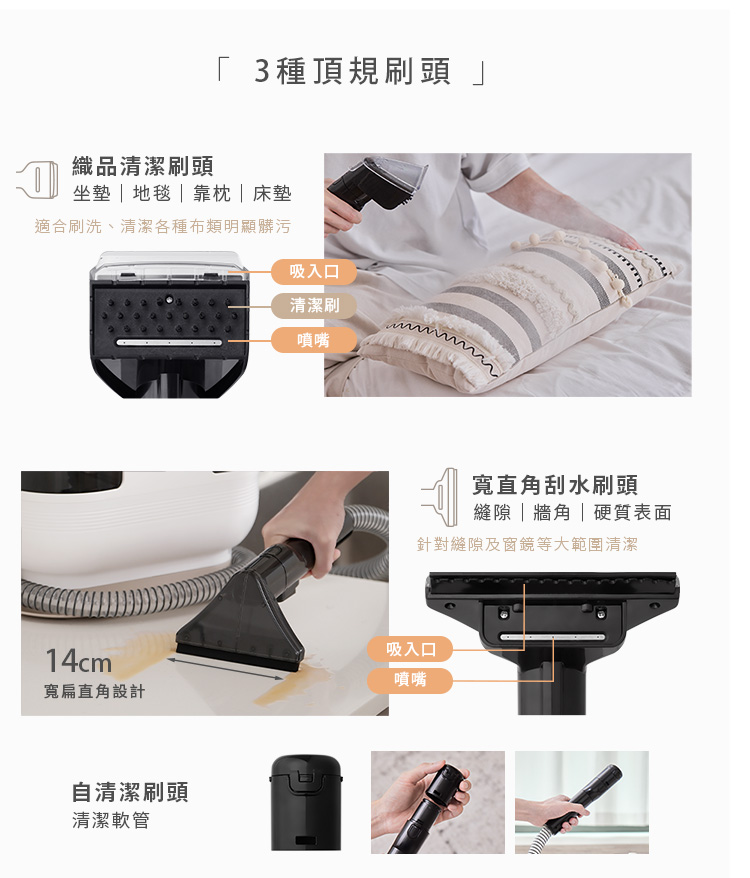 ● 三種功能刷頭,織物/硬質表面/自清潔水管蓋