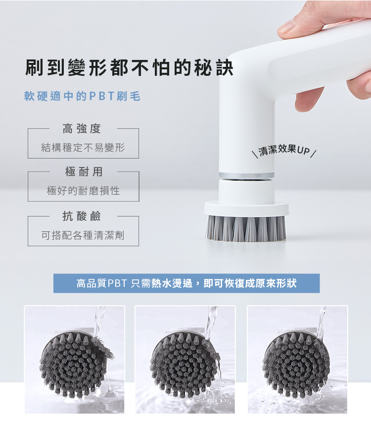 ● 高速清潔,PBT耐用刷頭可恢復原狀