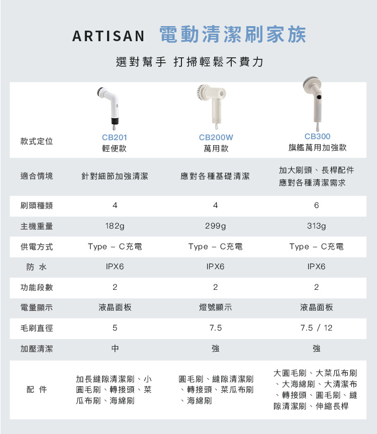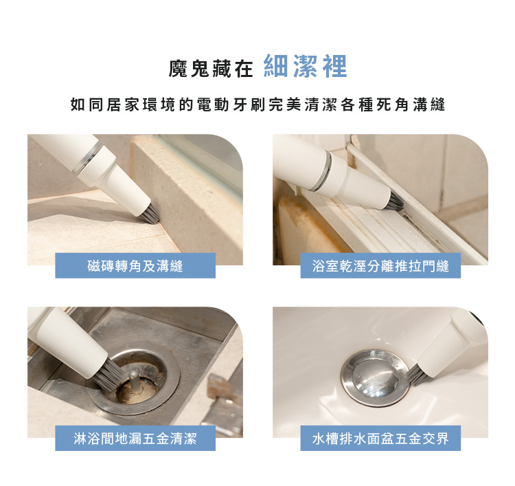 配件:主機、4種刷頭(圓刷/海綿刷/菜瓜布刷/縫隙刷)、充電線、說明書(含保卡)