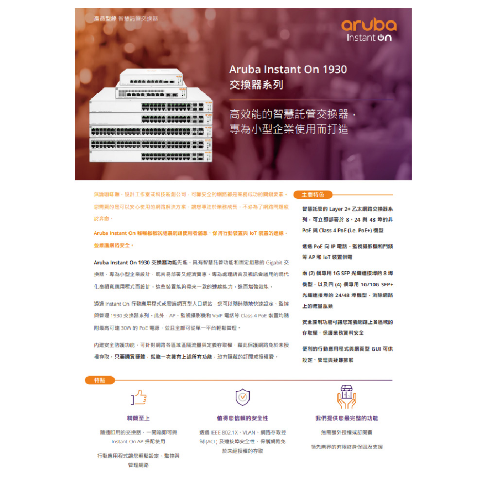 內建安全防護:具備安全控制功能,可透過IEEE 802.1X、VLAN、網路存取控制(ACL) 等技術,保護網路免於未經授權的存取。