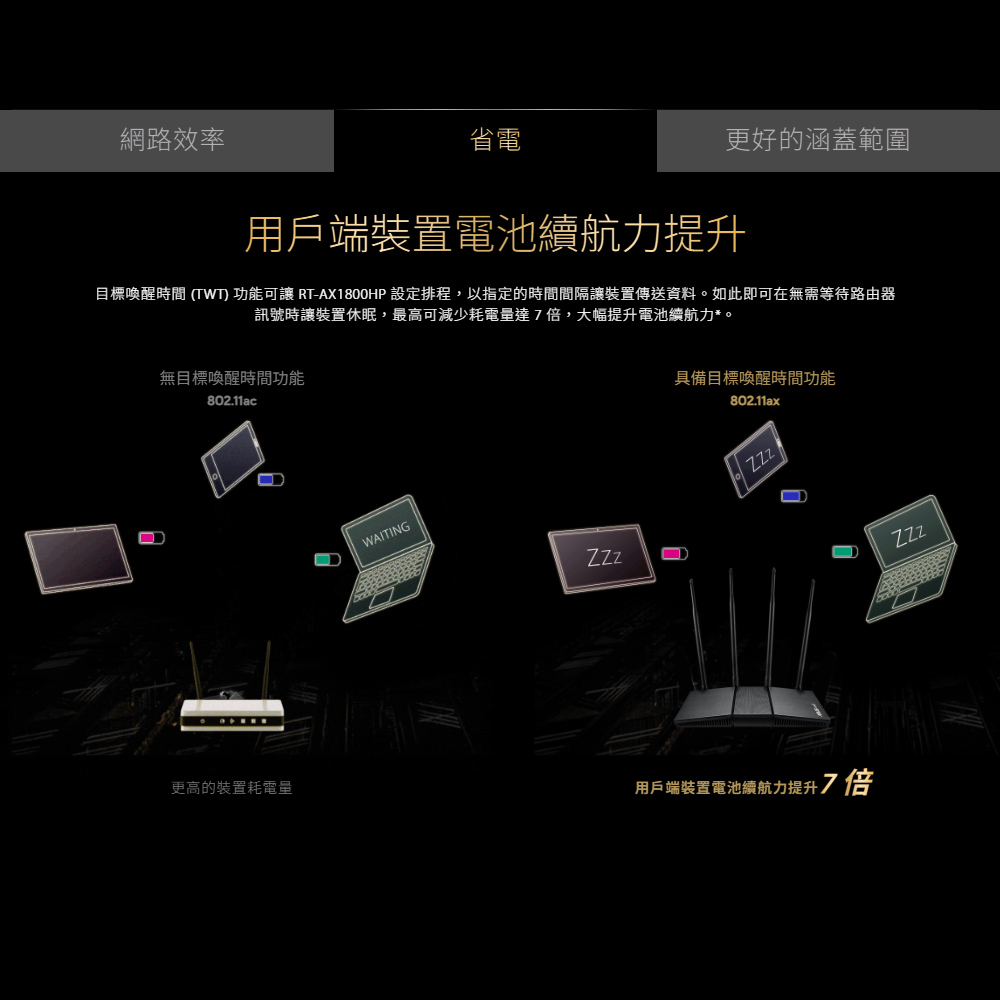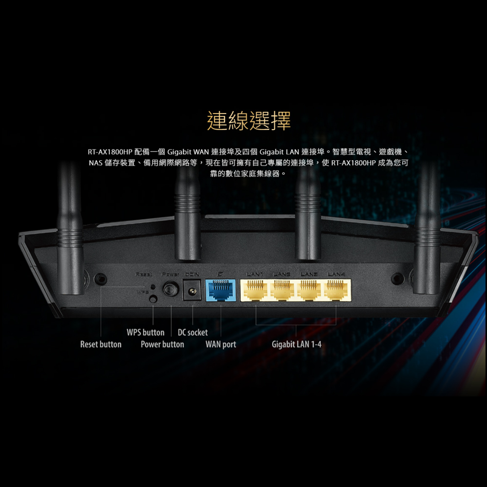 -超快Wi-Fi速度 : RT-AX1800HP支援1024-QAM以提供速度大幅提升的無線連線,總網路速度約1800Mbps,包括2.4GHz頻段的574 Mbps及5GHz頻段的1201 Mbps。
