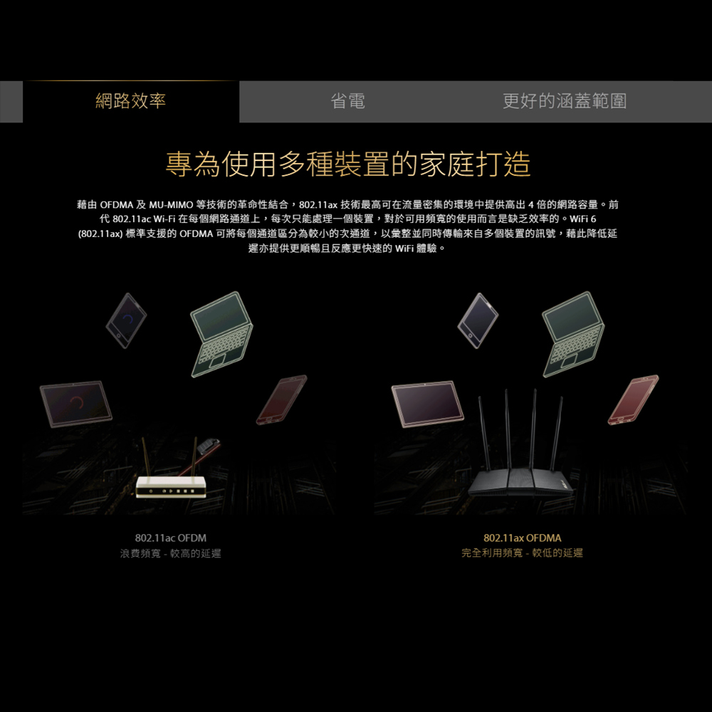 -提高容量和效率 : 不僅支援MU-MIMO,同時支援OFDMA技術以有效配置頻道,可同時與多個裝置進行通訊。