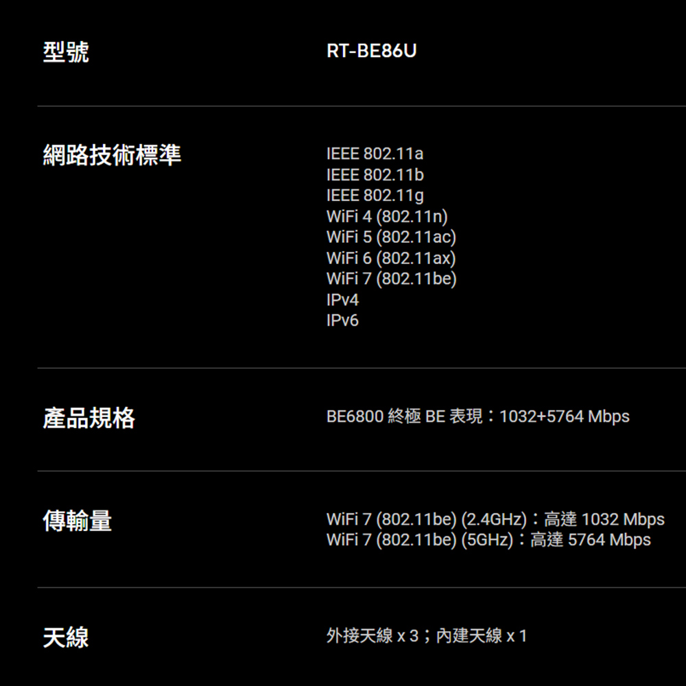 -ASUS RT-BE86U是舊型RT-AX86U的接續產品,搭載新一代 WiFi 7,可為您的連網生活提供6800 Mbps的超快雙頻網路速度。