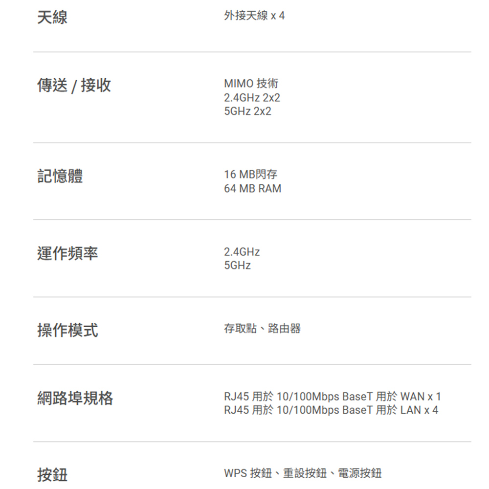 -四支外部天線提升覆蓋範圍和多裝置效能 : 2.4 GHz與5 GHz頻段各兩支天線。