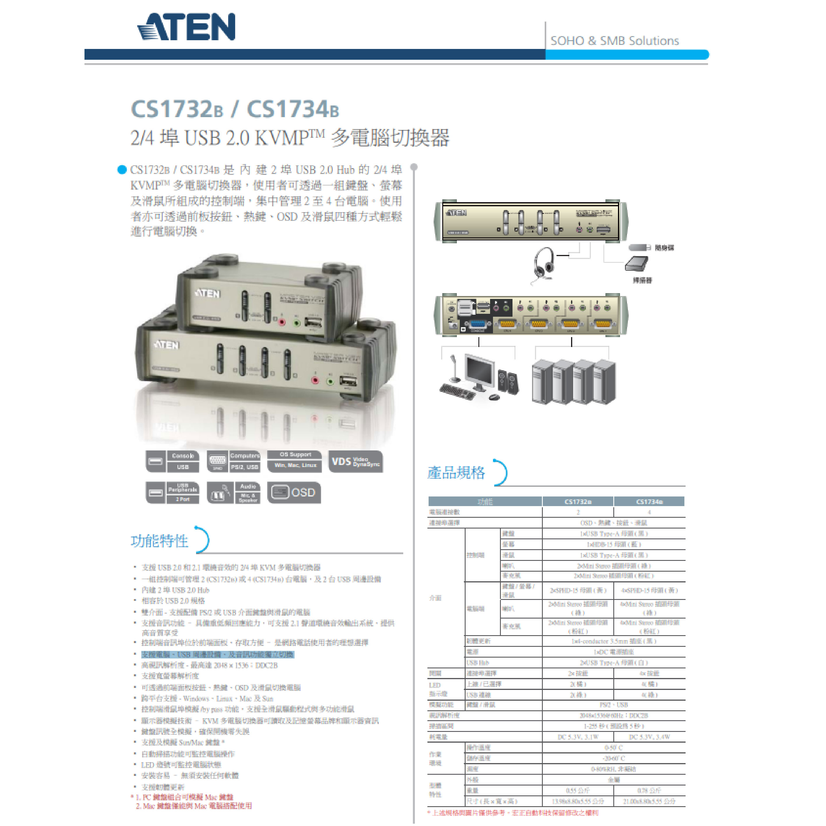 昌運監視器 ATEN 宏正 CS1734B 4埠 PS/2-USB VGA/音訊 KVMP™多電腦切換器