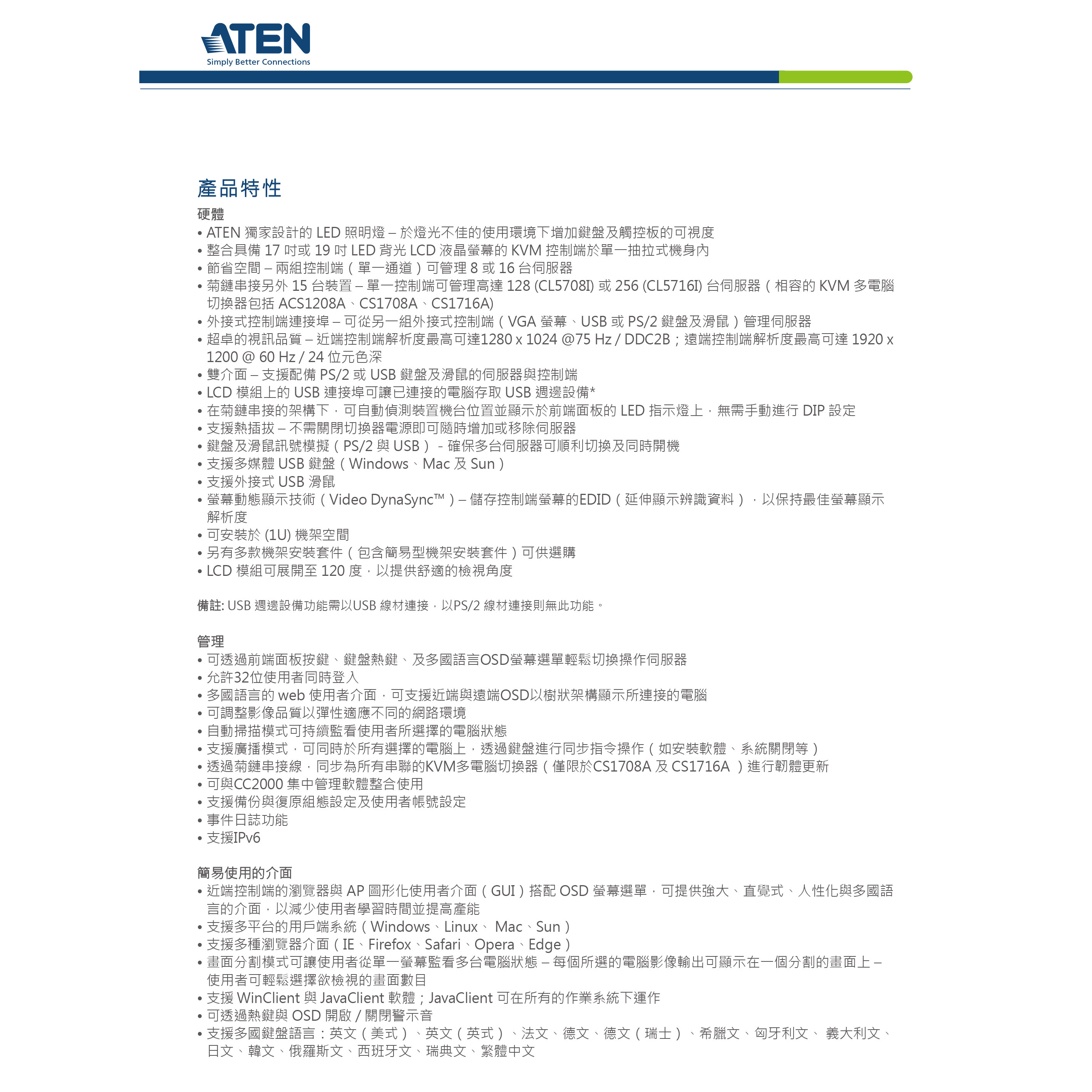 近端控制端解析度最高可達1280 x 1024 @75 Hz / DDC2B;遠端控制端解析度最高可達 1920 x1200 @ 60 Hz / 24 位元色深