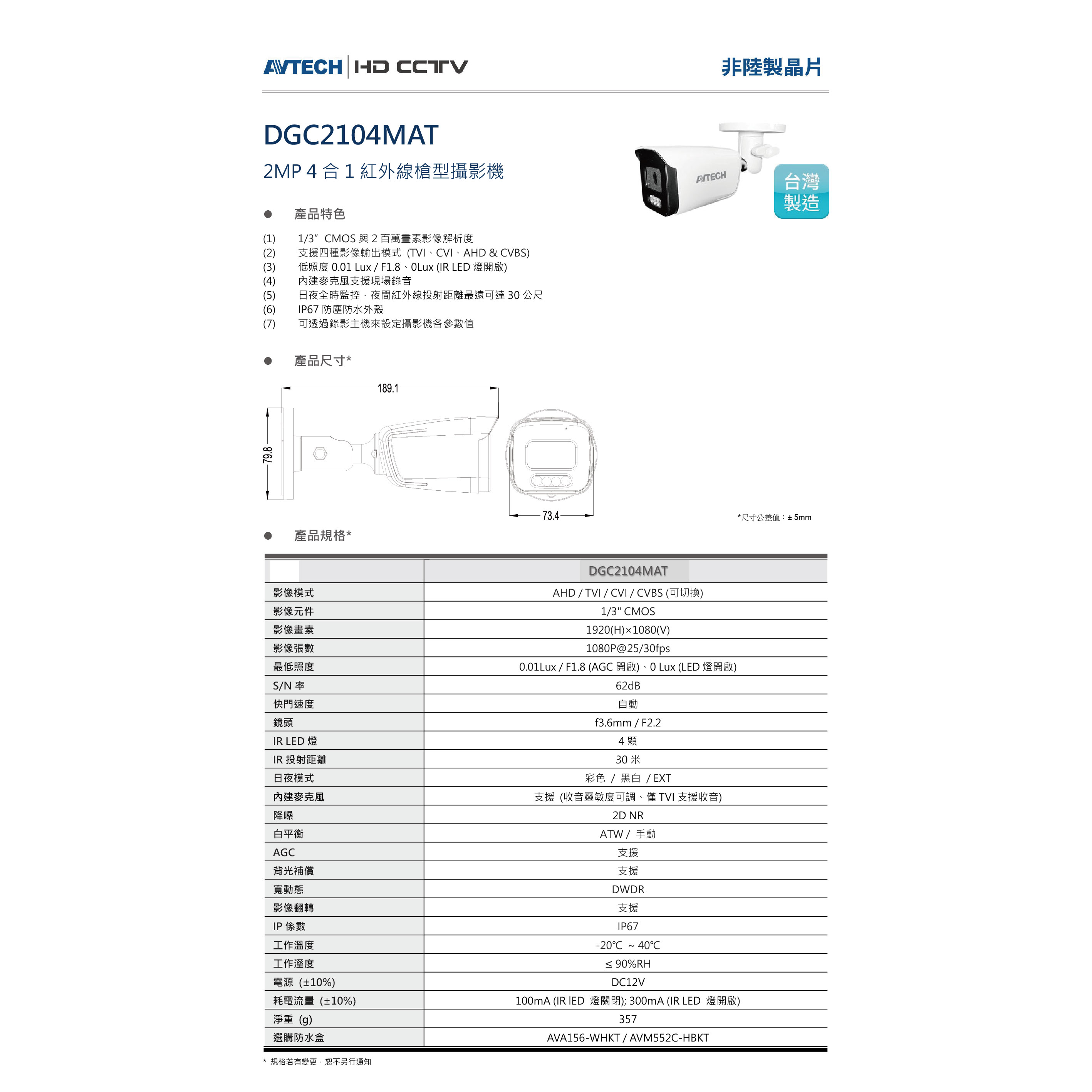 昌運監視器 AVTECH陞泰 DGC2104MAT 200萬畫素 4合1紅外線槍型攝影機 內建麥克風