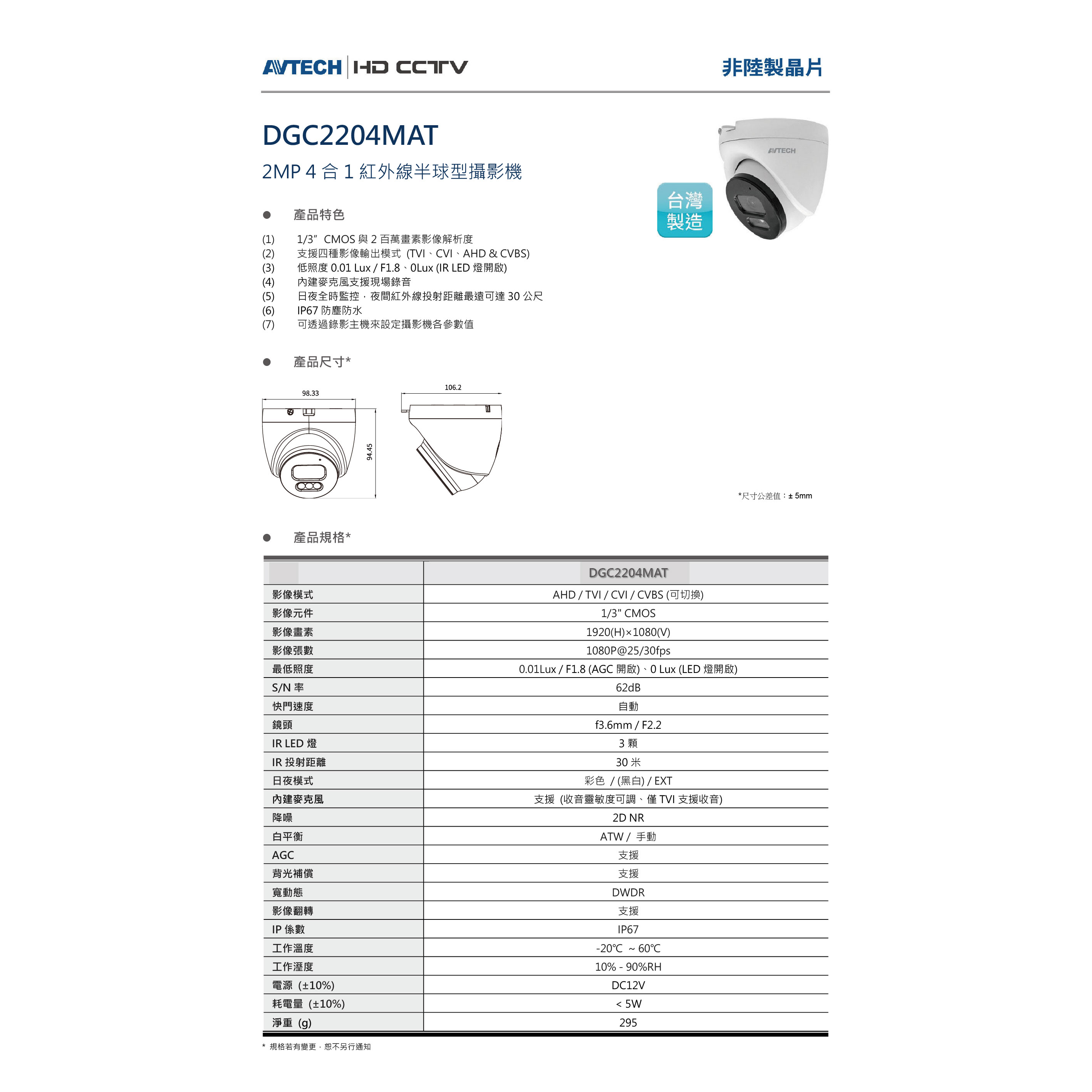 昌運監視器 AVTECH陞泰 DGC2204MAT 200萬畫素 4合1紅外線半球型攝影機 內建麥克風