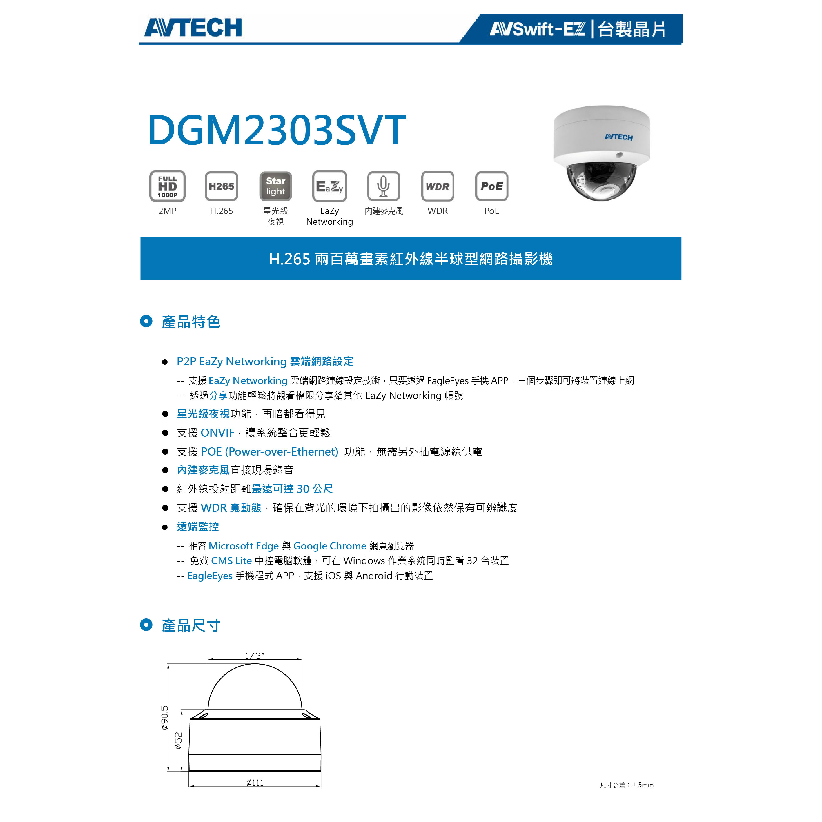 昌運監視器 AVTECH陞泰 DGM5303SVT 500萬畫素 紅外線半球型網路攝影機 內建麥克風