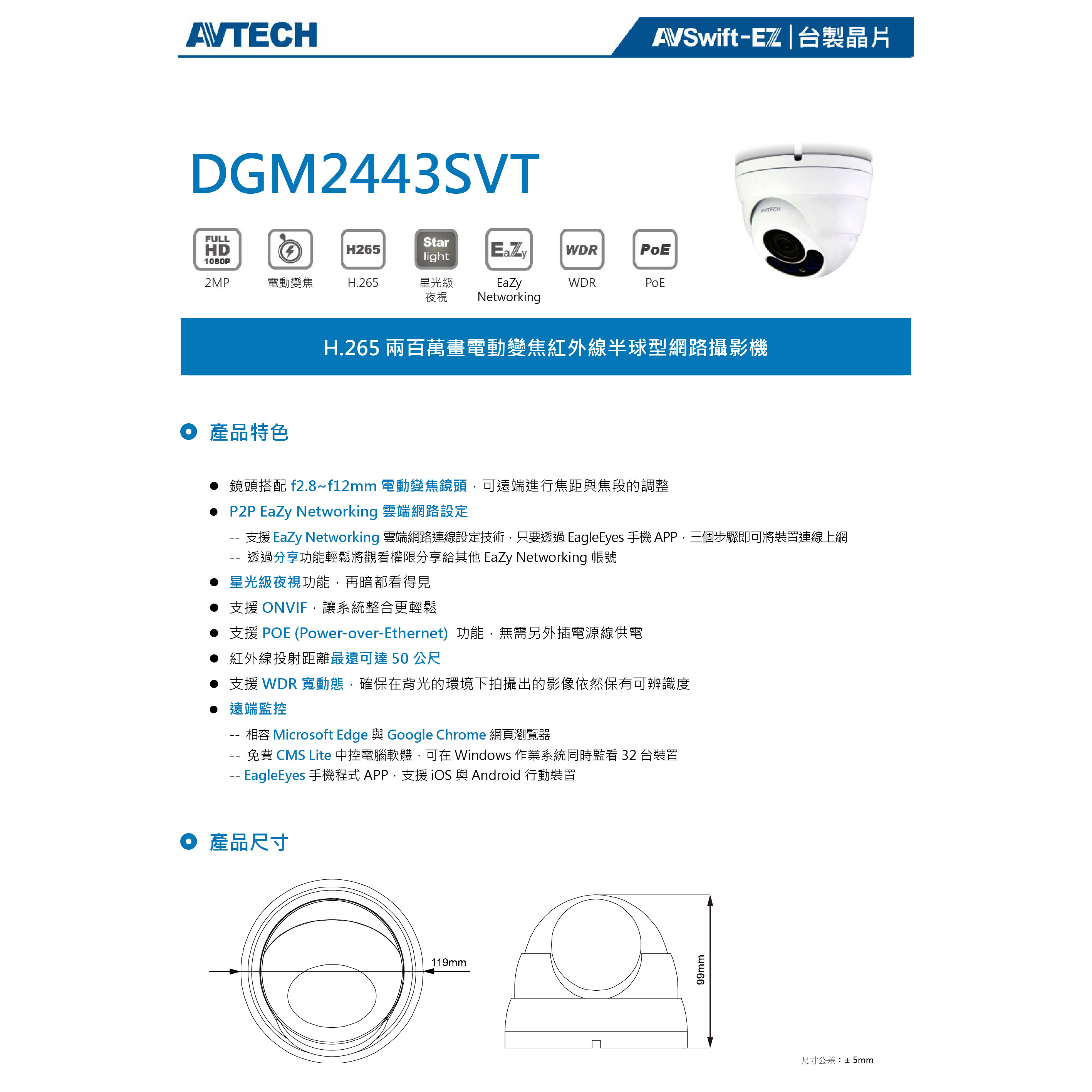 昌運監視器 AVTECH陞泰 DGM2443SVT 200萬畫素 電動變焦紅外線半球型網路攝影機