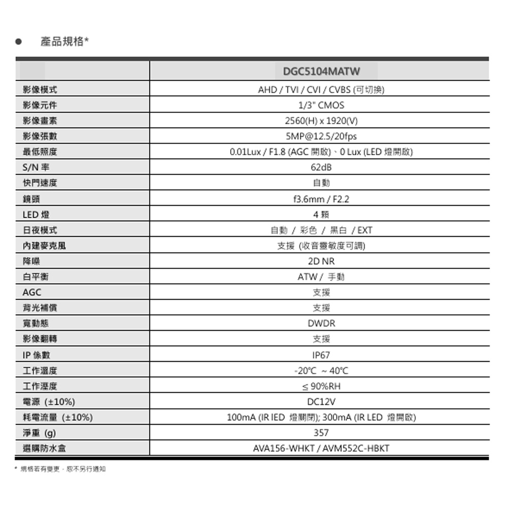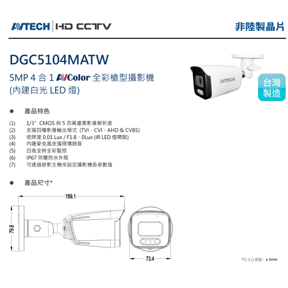 昌運監視器 AVTECH 陞泰 DGC5104MATW (DGC5104ATW) 5MP 4合1 全彩槍型攝影機 內建白光LED燈