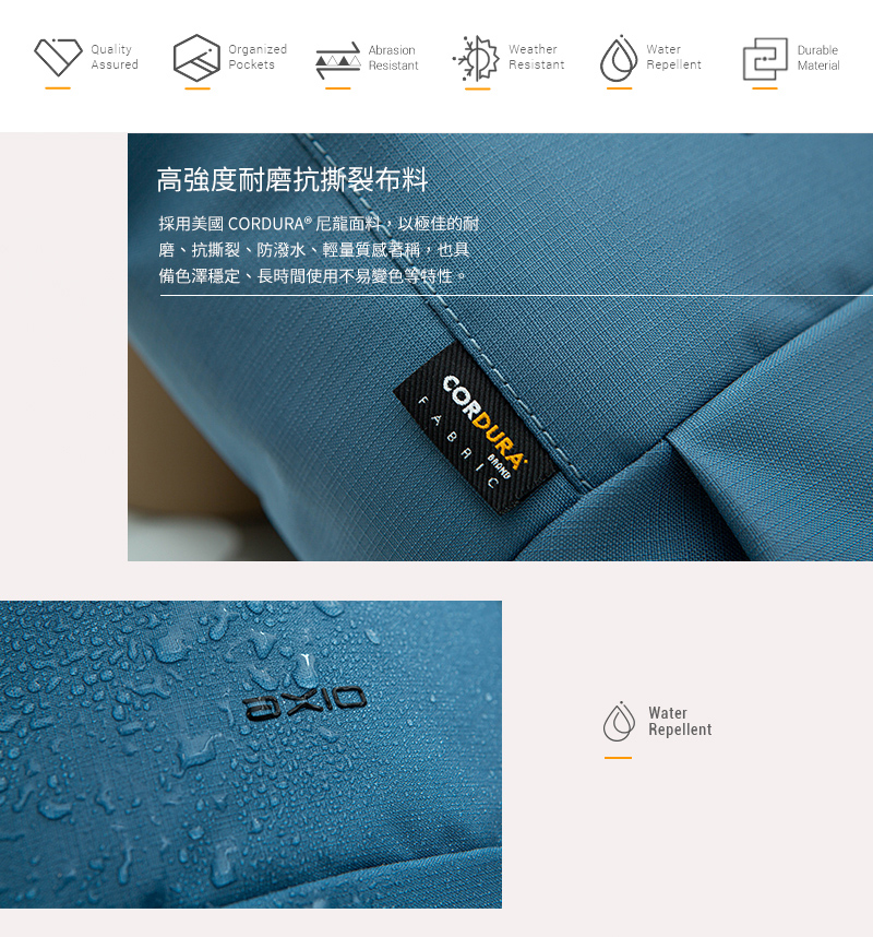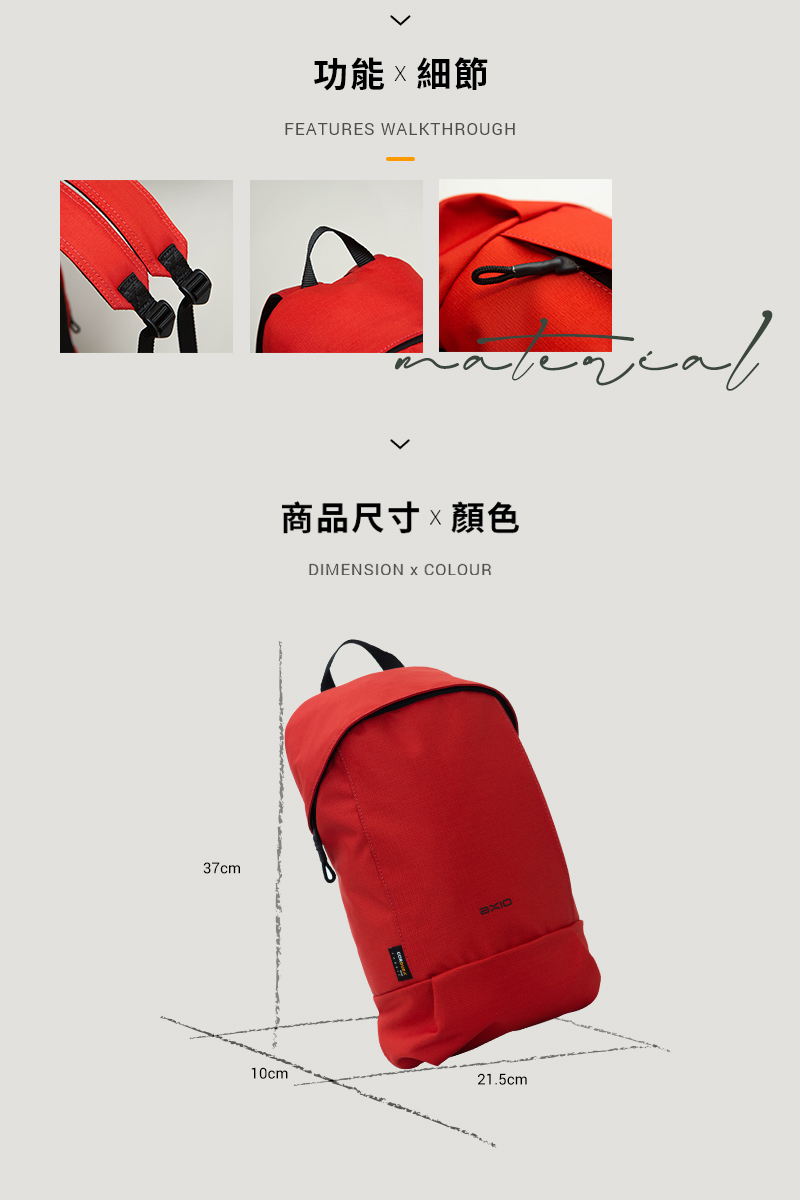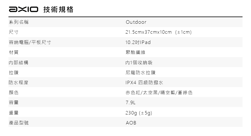 ★頂級CORDURA耐磨抗撕裂面料★可調式雙背帶★配置尼龍熱縮拉片★超輕量230g★可放10.2吋IPad尺寸: 21.5cmx37cmx10cm重量: 230g顏色: 赤色紅/太空黑/晴空藍/蒼綠色<AXIO退貨及維修保固>產品保固及我們的責任AXIO 提供完善售後服務,提供袋、包、箱全面的產品服務,我們致力於提供一流的產品,並通過嚴格測試,讓您在外出的旅途中,都能獲得即時、優質與信賴的保證!1.為維護AXIO消費者權益,全系列商品提供180天保固服務,產品保固自購買日起即享有保固服務。2.非官方認可的商品與非認可銷售通路所購買之商品,不在保固範圍內,3.若為「非人為、非外力、非不當使用」造成的商品瑕疵,請將商品送回至您原購買通路或AXIO原廠檢測,可享免費維修或依狀況更換商品。4.若為「人為、外力、不當使用」造成的商品瑕疵,請將商品送回至您原購買通路或AXIO原廠檢測,將酌收維修費用。(請保留發票或相關購買證明) (過季特賣商品除外)5.自然損耗狀況、特殊材質、自行使用非原廠配件維修等恕不提供維修服務。背包防水塗層多為環保可分解材質,所有環保材質均有一定的使用年限,膠面水解是屬於正常現象。退換貨須知:商品到貨享十天猶豫期之權益(注意!猶豫期非試用期),辦理退貨商品必須是全新狀態且包裝完整,商品一經拆封,等同商品價值已受損,僅能以福利品出售,若需退換貨,我方須收取價值損失之費用(回復原狀、整新費),請先確認商品正確、外觀可接受,再行開機/使用,以免影響您的權利,祝您購物順心。為保障您購物權益,開箱過程請全程錄影。售後服務:如您收到商品,請依正常程序儘速檢查商品,若商品發生新品瑕疵之情形,您可申請更換新品或退貨,或於平日周一~周五上午10:00-17:00與我們聯絡。