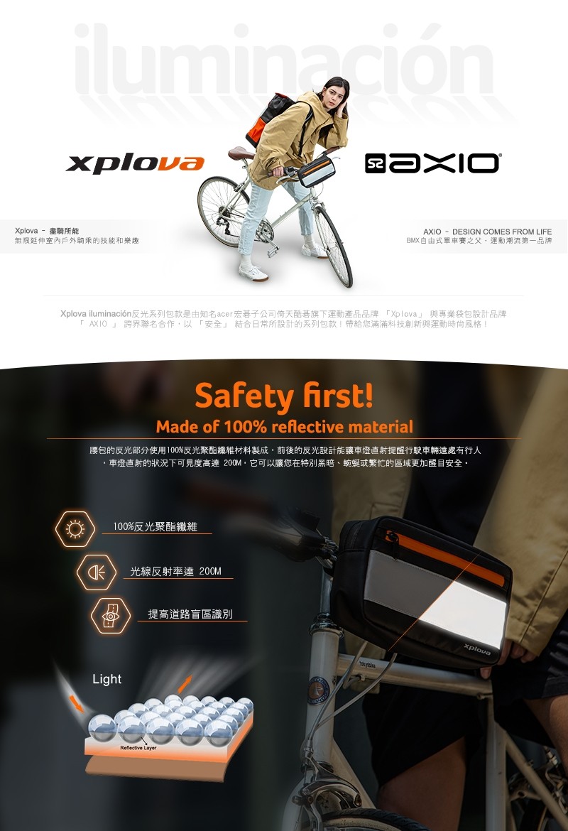 我們所居住的城市只對行車友善,試想看看,你是否走在路上或騎行時都心驚膽戰?尤其在夜間視野不佳導致很多交通意外都因為行人穿著黑暗或光線不足導致,這也是Xplova iluminación系列誕生的原因。 Xplova iluminación系列是安全與反光融合的概念設計,2L的腰包則是方便每天隨身攜帶,能放入鑰匙、手機、錢包等日常小物,最特別的胸前包也能一秒變自行車手把包及胸前包使用。