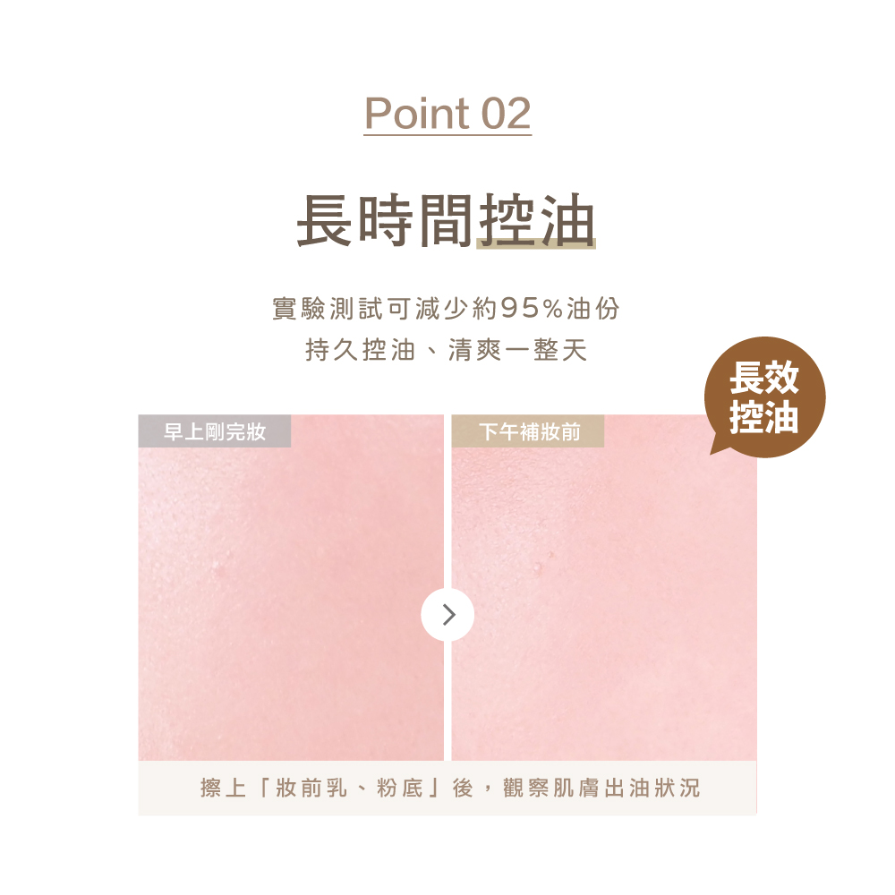 3.長時間控油:經實驗測試有效減少出油量,能幫助底妝持久、清爽一整天