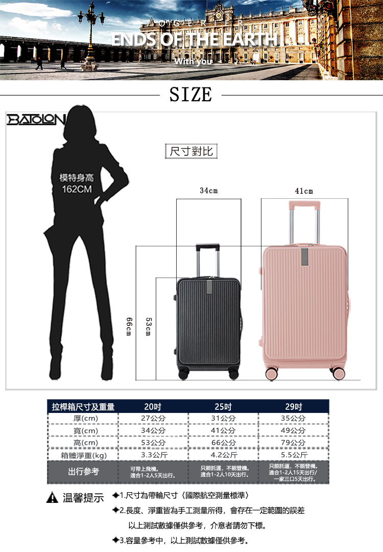 ◆尺寸(長*厚*高,含輪高):20吋/約34*27*53cm、25吋/約41*31*66cm、29吋/約49*35*79cm