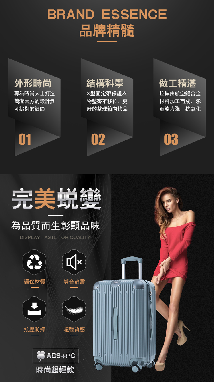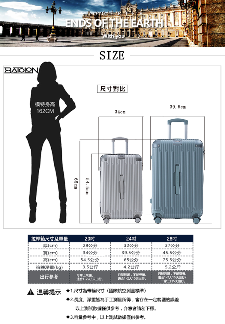 ◆尺寸(長*厚*高,含輪高):20吋/約34*29*54.5cm、24吋/約39.5*32*65cm、28吋/約45.5*37*75.5cm