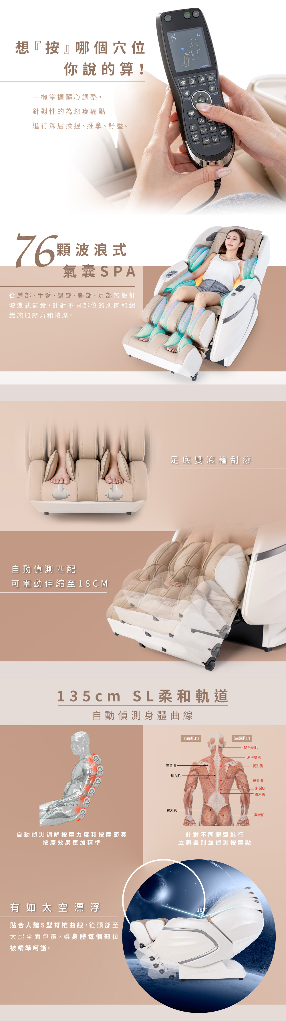 ▲超能5D魔球,6檔深度、5檔強度、5檔速度▲雙科技自動偵測,精準定位▲智能APP連線操作,訂製專屬按摩行程▲智能按摩程序 總共459種模式▲396種按摩手法+56種自動模式+7種運動修復▲全身立體式38顆氣囊(肩頸/手臂/臀部/腿足)▲小腿按摩智能感知,匹配不同腿長,可伸縮18CM▲足部360度全包覆,足底刮痧滾輪按摩▲全身懸浮按摩體驗 兩段式零重力▲45度石墨烯腰部熱敷▲超長135CM SL型柔和軌道▲飛梭旋鈕操控面板▲大屏幕液晶操作手控器