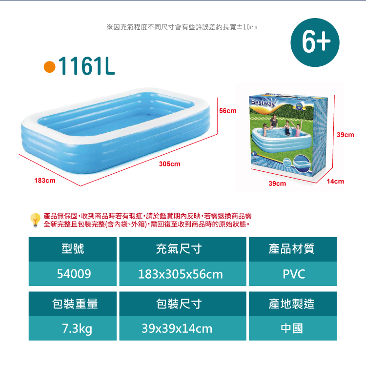 充氣尺寸:外徑305x183x56 cm
