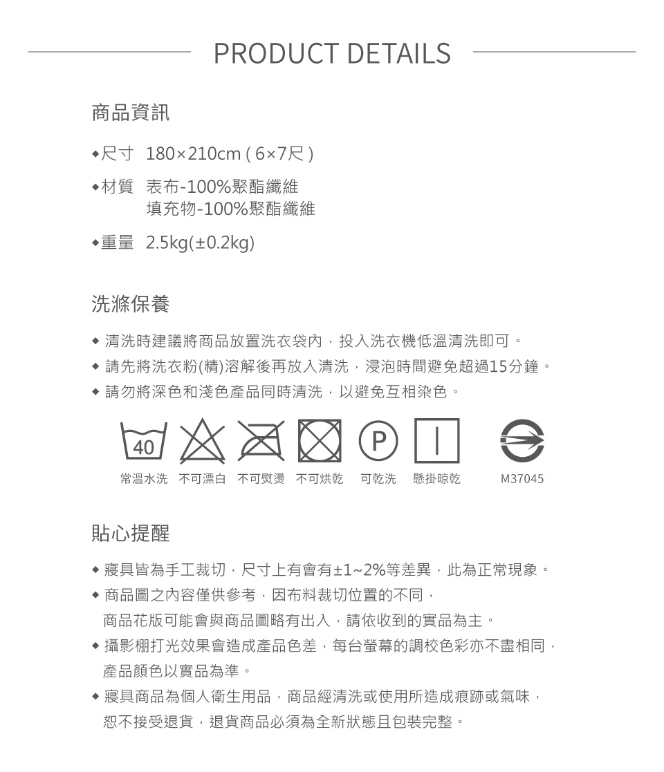 ◆清潔保養方式:可水洗/不可烘乾/不可漂白/勿使用強力漂白清潔劑/浸泡時間請勿超過20分鐘/建議可放入大型洗衣袋後再清洗
