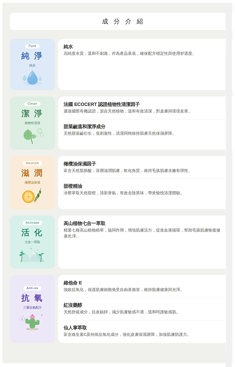 純水、法國ECOCERT認證植物性清潔因子、高山植物七合一萃取、甜菜鹼溫和潔淨成分、甜橙精油、橄欖油保濕因子、維他命E、紅沒藥醇、仙人掌萃取