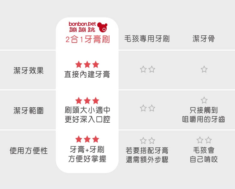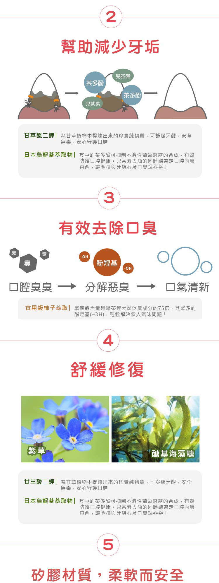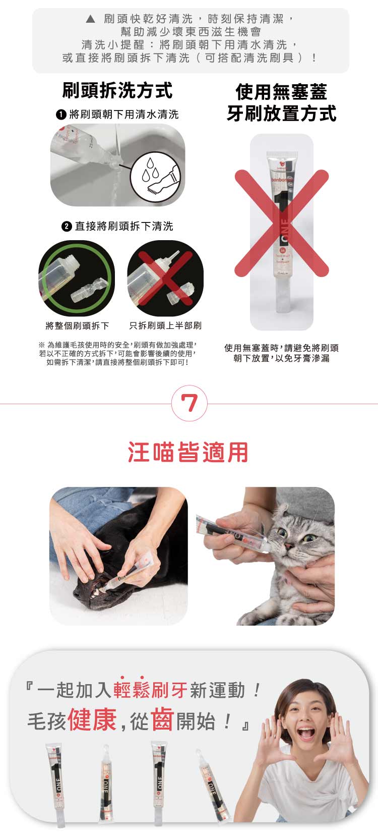 不用擔心不受控的狗狗喵喵怎麼刷牙!!獨立幫毛孩刷牙超Easy~使用天然甘草及烏龍茶萃取,毛孩舔到也不擔心~ ═══ MIT 台灣製造,好安心 ═══ ❶ 牙膏即牙刷|使用超 Easy ❷ 減少牙垢|甘草及烏龍茶萃取 ❸ 去除口臭|柿子萃取+蜂膠 ❹ 口腔黏膜保濕|醣基海藻糖 ❺ 安全刷毛|矽膠柔軟而耐咬 ❻ 簡單清洗|避免壞東西孳生 ❼ 汪喵適用|適合不同體型毛孩 ●單支有效期限在彩色卡片上,建議毛拔麻請不要丟喔!