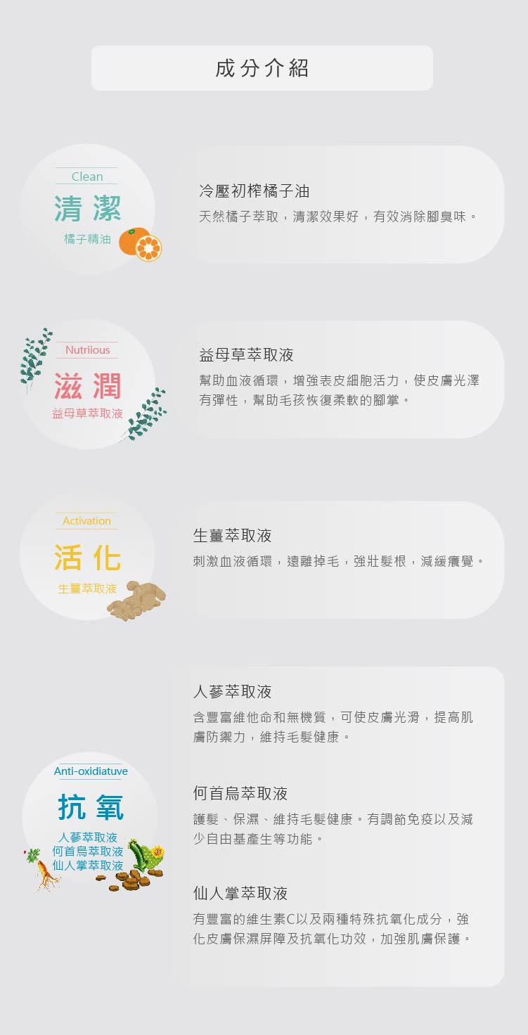 純水、椰子油系界面活性劑、檸檬酸、冷壓初榨橘子油、何首烏萃取液、益母草萃取液、生薑萃取液、人蔘萃取液、仙人掌萃取物、維他命E、乳化劑、保濕劑