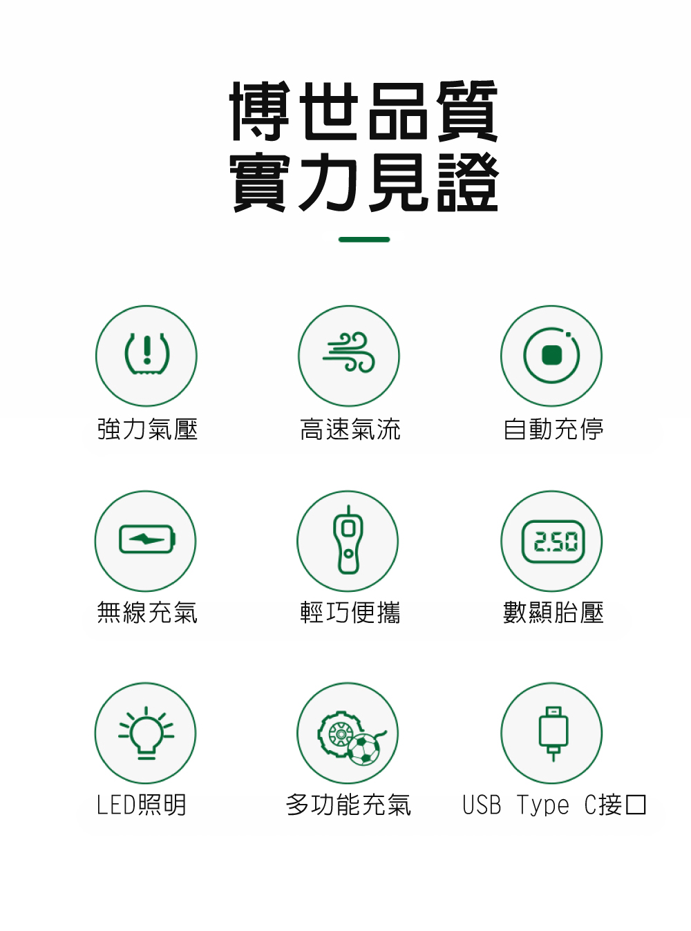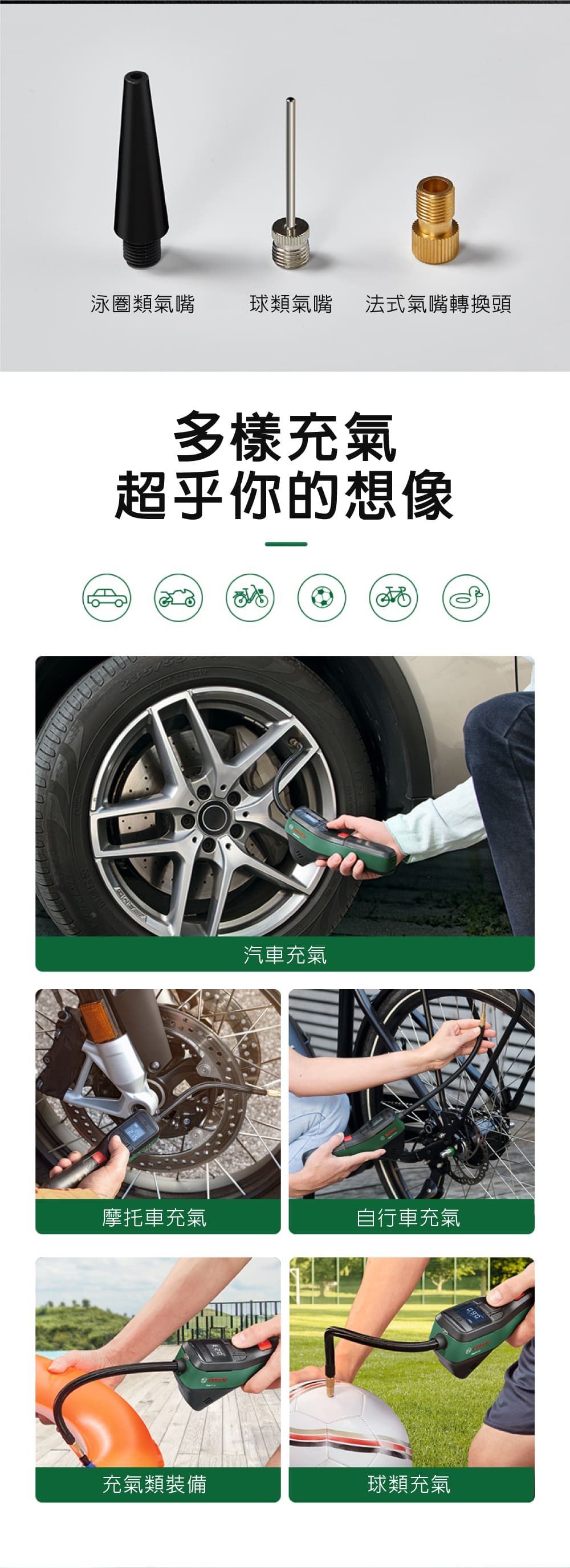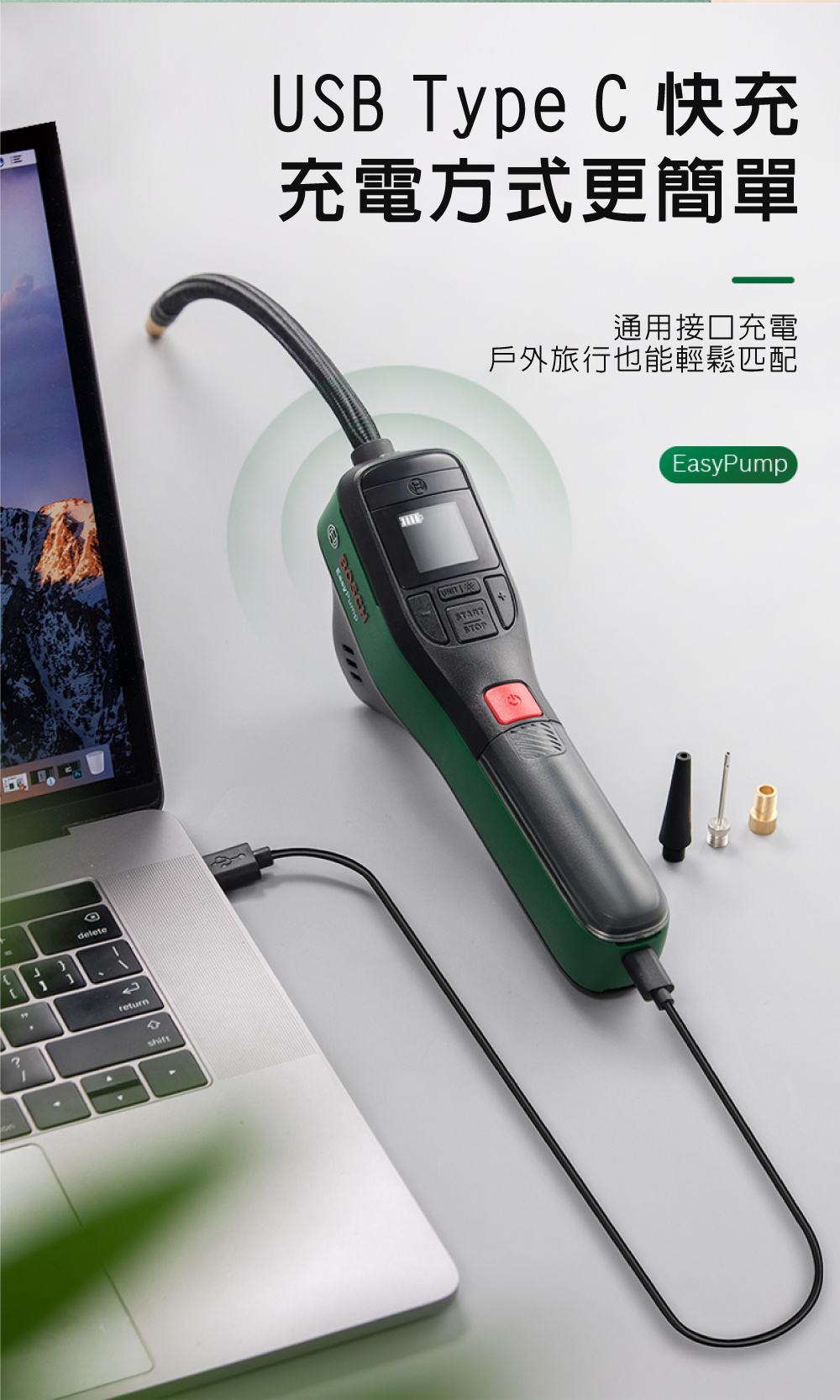 商品介紹.利用即時測量及自動停止功能充氣至最高10.3 bar。.適合為輪胎(汽車、機車、自行車)、球類及小型水上運動設備充氣。.將一切所需拿在手上:各種轉接器都整齊地收納在工具把手中。.直覺而實用:易於使用、人體工學設計及附有大型顯示幕的小巧設計。.內建電池及USB-C®充電功能,以LED燈提供明亮照明。規格說明‧ 品名:BOSCH 多功能電動打氣機3.6V EasyPump‧ 內容物:電動打氣機x1、收納袋x1、充氣嘴配件x3、USB Type C充電線x1‧ 電池電壓:3.6V‧ 最大Ah:3Ah‧ 最大壓力:10,30 巴‧ 最大壓力:150psi‧ 最大壓力:1.030kPa‧ 最大輸出容積:10 l/min‧ 水管長度:0,2m‧ 充電時間:約3小時‧ 尺寸:長49x寬215x高106mm‧ 重量:0.4KG‧ 產地:中國注意事項1. 以上提供的圖片皆為"示意圖",僅供參考,請依照實際產品規格為主。2. 任何以BOSCH打包帶包裝的商品均為原廠正貨,商品因須放入保卡及規格標,所以包裝之黏封膠帶需割開,此為必要之流程。
