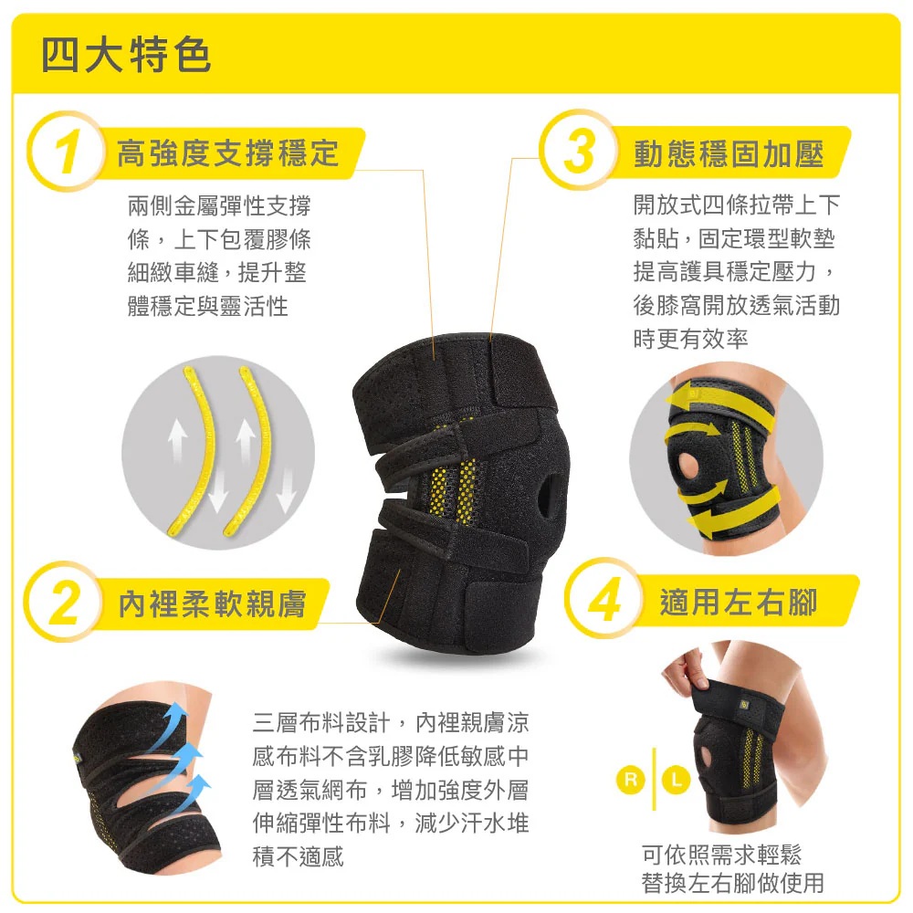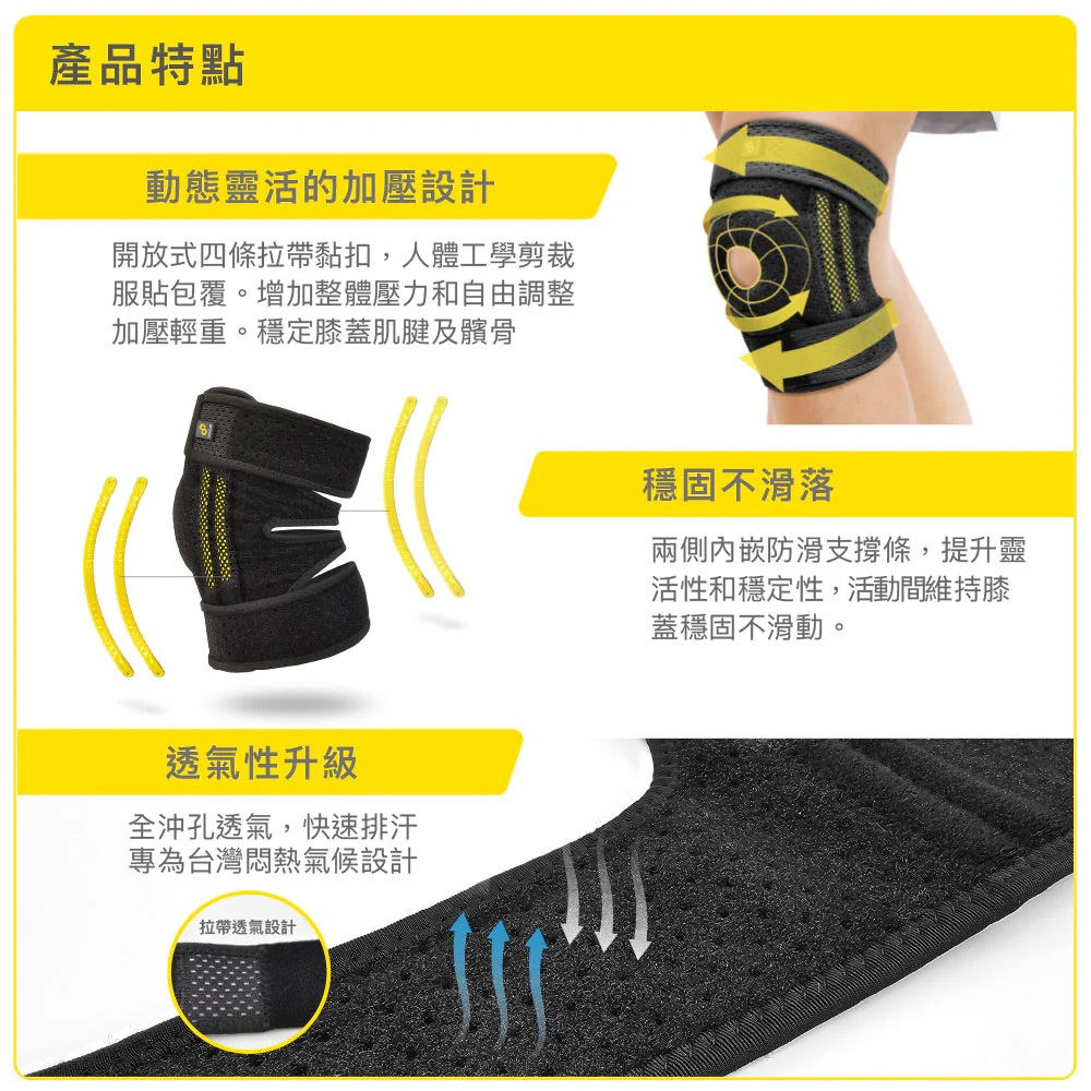 ●高強度支撐穩定兩側金屬彈性支撐條,上下包覆膠條細緻車縫,提升整體穩定與靈活性●內裡柔軟親膚三層布料設計,內裡親膚涼感布料不含乳膠降低敏感中層透氣網布,增加強度外層伸縮彈性布料,減少汗水堆積不適感●動態穩固加壓開放式四條拉帶上下黏貼,固定環型軟墊提高護具穩定壓力,後膝窩開放透氣活動時更有效率 ●適用左右腳可依照需求輕鬆替換左右腳做使用1、商品組合/規格:BRACOO奔酷護膝(雙支撐透氣親膚可調) KP322、醫療器材許可證◆核定品名: "奔酷" 肢體裝具 (未滅菌)◆核准字號:衛部醫器陸輸壹登字第004320號◆藥商名稱:康璽國際有限公司◆製造廠名稱:COMFYSTONE CO., LTD◆製造廠地址:NORTH HEAD TANGLEI RD, INDUSTRIAL DEMOSTRATION AREA, RADAR SCIENCE & TECHNOLOGY ZONE, TANGGOU TOWN, SHUYANG COUNTY, SUQIAN CITY, JIANGSU PROVINCE 223611, CHINA3、藥商許可執照◆醫材許可執照字號:中市醫材販 字第 MD6203022382 號◆藥商名稱:佑全藥品股份有限公司◆藥商地址:台中市西屯區福和里台灣大道四段925號20樓之1◆諮詢專線電話:0800-046-111 / 0800-557-6884、製造日期:詳見商品包裝標示及說明5、有效期間或保存期限:詳見商品包裝標示及說明6、消費者使用前應詳閱醫療器材說明書 ◆ 注意事項1.產品彈性壓力及功能隨穿戴時間及頻率遞減,為確保產品效用達最大發揮,建議定期更換。2.穿戴後如有不適,請即停止使用並就醫診療。3.清潔用中性洗劑沖洗後風乾,請勿日照、熱烘。4.購買前請先檢查產品有無瑕疵;個人貼身用品,弄髒、毀損或洗滌過後,恕無法更換。 消費者使用前應詳閱醫療器材說明書