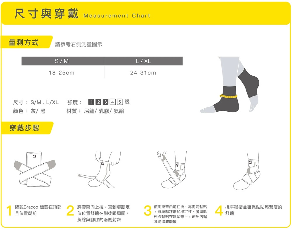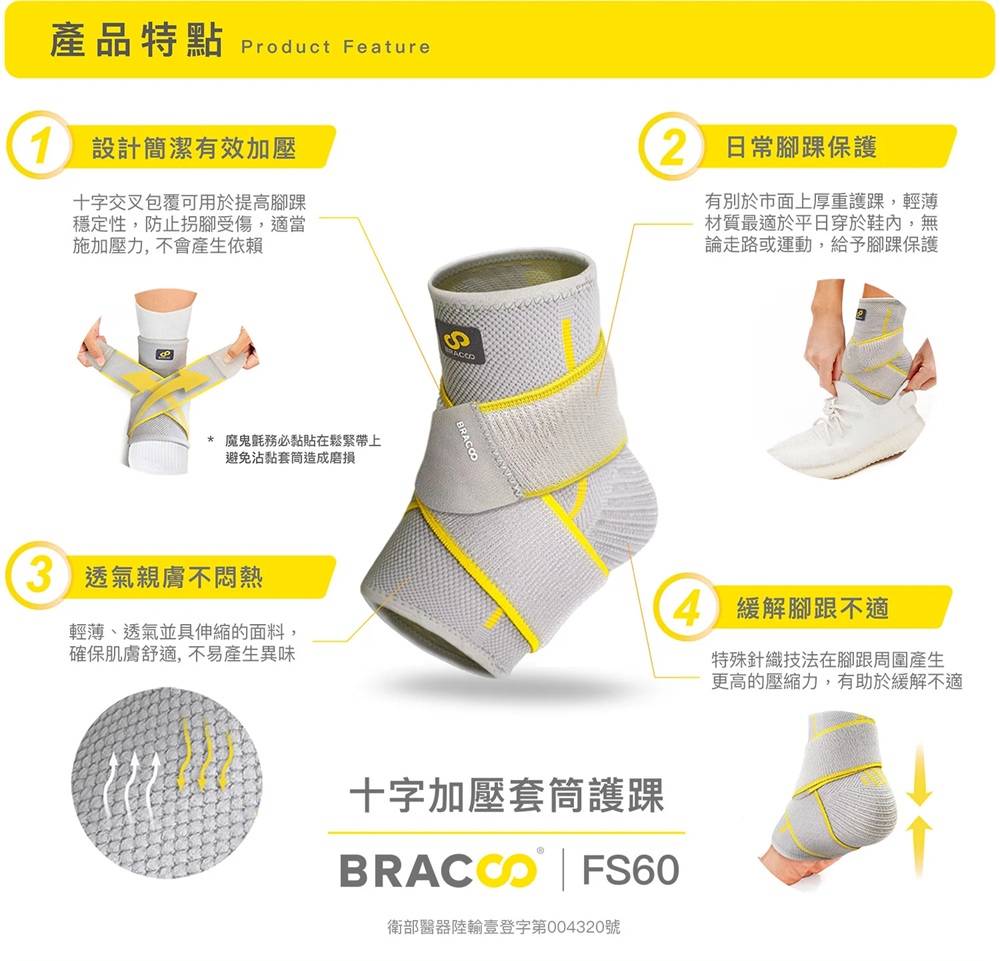 ●十字交叉包覆,設計簡潔有效加壓●日常腳踝保護,輕薄材質適合平日穿於鞋內●特殊針織技法,有助於緩解腳跟不適1、商品組合/規格:BRACOO奔酷腳踝(十字加壓套筒 S/M灰) FS602、醫療器材許可證◆核定品名: "奔酷" 肢體裝具 (未滅菌)◆核准字號:衛部醫器陸輸壹登字第004320號◆藥商名稱:康璽國際有限公司◆製造廠名稱:COMFYSTONE CO., LTD◆製造廠地址:NORTH HEAD TANGLEI RD, INDUSTRIAL DEMOSTRATION AREA, RADAR SCIENCE & TECHNOLOGY ZONE, TANGGOU TOWN, SHUYANG COUNTY, SUQIAN CITY, JIANGSU PROVINCE 223611, CHINA3、藥商許可執照◆醫材許可執照字號:中市醫材販 字第 MD6203022382 號◆藥商名稱:佑全藥品股份有限公司◆藥商地址:台中市西屯區福和里台灣大道四段925號20樓之1◆諮詢專線電話:0800-046-111 / 0800-557-6884、製造日期:詳見商品包裝標示及說明5、有效期間或保存期限:詳見商品包裝標示及說明6、消費者使用前應詳閱醫療器材說明書 ◆ 注意事項1.產品彈性壓力及功能隨穿戴時間及頻率遞減,為確保產品效用達最大發揮,建議定期更換。2.穿戴後如有不適,請即停止使用並就醫診療。3.清潔用中性洗劑沖洗後風乾,請勿日照、熱烘。4.購買前請先檢查產品有無瑕疵;個人貼身用品,弄髒、毀損或洗滌過後,恕無法更換。 消費者使用前應詳閱醫療器材說明書
