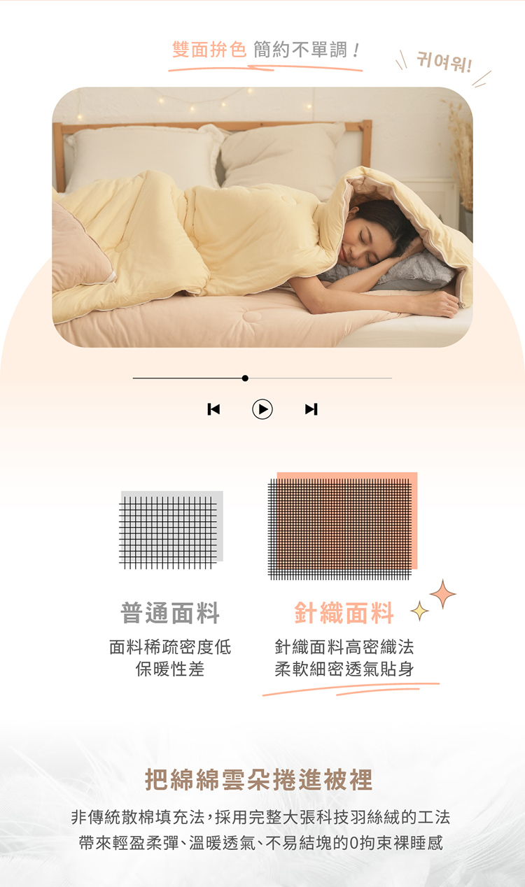 ◇表布:頂級針織布(100%聚酯纖維)◇填充物:羽絲絨(100%聚酯纖維)◇尺寸:5x7尺(152x212公分±3%)◇重量:2.1kg±3%◇顏色:產品如圖示,網頁圖片因拍攝關係或螢幕色差,與實品略有差異,產品圖僅供參考,實品顏色更佳。◇清潔方式:可水洗(水溫不可超過攝氏30度)/不可乾洗/不可烘乾/不可漂白/不可熨燙/懸掛晾乾/建議放入大型洗衣袋後再清洗◇特別說明:本產品網頁圖片僅為示意圖參考,不含拍攝道具,實際出貨件數以「商品內容」說明為主。◆退換貨應將商品妥善包裝完整,並以廠商寄送時所使用紙箱或破壞袋再原封備妥,若原紙箱或破壞袋已遺失,請於商品外再另行密封包裝,勿直接在商品原廠包裝上粘貼宅配單或書寫文字。如有以下情況發生,將視損毀程度折扣退款金額,嚴重者則不允退換: 1.商品附屬配件、贈品損毀╱不齊全2.商品經使用過、清洗後,沾染任何異味(體味、香味、菸味等)。