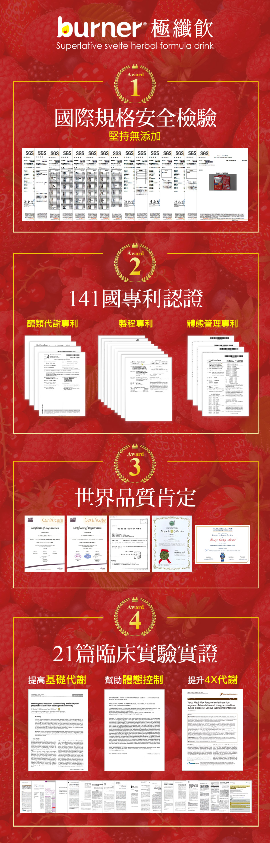 水、綜合莓濃縮汁(蘋果、蔓越莓、草莓、覆盆莓、櫻桃、黑醋栗、醋栗)、難消化性麥芽糊精(Fibersol-2)、野櫻莓濃縮汁、D-山梨糖醇(甜味劑)、香料(藍莓)、藤黃果萃取物、檸檬酸、綠茶萃取物、瑪黛茶萃取物、甜菊甜苷(甜味劑)、瓜拿納萃取物、透納萃取物、菸鹼酸鉻複合物、流行鏈球菌發酵物(含透明質酸鈉)