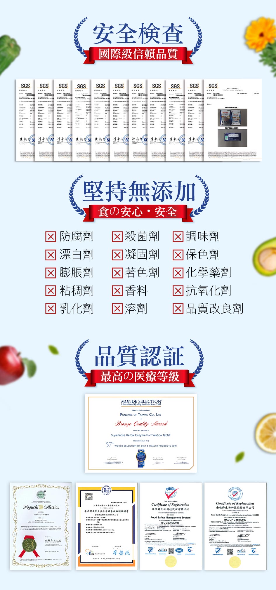 氧化鎂、乳糖、食用大黃、決明子萃取物、硬脂酸鎂、羥丙基甲基纖維素、脂肪分解酵素、二氧化矽、聚乙二醇、韓國專利啤酒酵母胜、日本專利玉米來源可溶性纖維(Fibersol-2)、136綜合蔬果酵素粉、巴西酵素(昆布、裙帶菜、紫菜、香菇、檸檬馬鞭草、苦艾、西番蓮、金盞草、大飛揚草、牛筋草、檸檬草、大茴香、瑪黛茶、魚腥草、紫蘇、薰衣草、貓薄荷、洋甘菊、生薑、益母草、芭樂葉、丁香、咸豐草、迷迭香、燕麥片、玉米、大麥、豌豆、紅豆、薏仁、芝麻、刺槐豆、小米、大豆、爆裂玉米、黑麥、黑豆、鷹嘴豆、扁豆、糙米、鳳梨、香蕉、蘋果、木瓜、芭樂、哈密瓜、酪梨、梅子、西印度櫻桃、檸檬、葡萄乾、芒果、楊桃、西瓜、腰果、巴西堅果、奇異果、西洋梨、巴西莓、卡姆果、萊姆、玫瑰果、橘子、樹莓、柳橙、水蜜桃、蘿蔔、高麗菜、蓮藕、牛蒡、菊苣、甘藷、南瓜、木薯、番茄、羽衣甘藍、青椒、紅甜菜、胡蘿蔔、長南瓜)