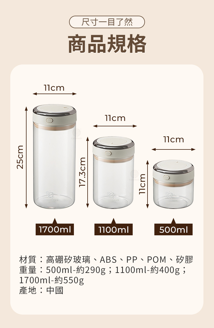 我每天都能喝到新鮮的好咖啡!☕💕以前總覺得家裡的咖啡豆放久了就會變味,明明剛買的時候香氣濃郁,沖泡出來卻總是少了點層次感而風味變得苦澀又不均勻。後來才知道,咖啡豆烘焙後會釋放二氧化碳,如果沒有好好醒豆或密封,香氣和風味都會流失!😱 自從入手這款會呼吸的「咖啡豆真空密封罐」,我的咖啡體驗真的完全升級了!☕ 貼心醒豆模式,讓咖啡風味更迷人!密封罐有醒豆閥,只要打開它,就能讓咖啡豆自然排出二氧化碳,3~5天後醒豆完成,香氣更濃,味道更圓潤順口! 每天沖泡時,光是聞到那股濃郁的咖啡香,就覺得超幸福!😍🔒 一鍵密封,完美鎖住新鮮!醒豆完成後,只要按下密封鍵,就能排出氣氣,罐內瞬間變成密封狀態,防潮又防氧化。以前遇到梅雨季節,咖啡豆很容易受潮變味,但這款密封罐完全沒有這個問題,每次沖泡都像剛開封的新鮮感!✨📅 內建日期轉盤,不再忘記最佳賞味期!我有時候一次會買好幾包咖啡豆,存放太久就會忘記哪包是新鮮的,哪包該先喝。這款密封罐有日期轉盤,直接標記存放日期,現在沖咖啡時一目了然,不用擔心喝到放太久的豆子!🛡️ 密封防漏,倒置也不怕漏氣!蓋子搭配的矽膠密封圈很厚實,不管怎麼擺放都不會漏氣,密封效果超好!而且比起塑膠罐,高硼矽耐熱玻璃更安心,清洗時用熱水沖一沖就乾淨了,完全不殘留異味!🍪 一罐多用,咖啡、零食、茶葉通通收納!雖然我是為了咖啡豆買的,但後來發現它真的超萬用! 我用來裝茶葉、零食餅乾、五穀雜糧,甚至花茶、藥材、乾貨,防潮效果一樣完美!從醒豆到密封,每個細節都幫你顧好,讓每一杯咖啡都保持最純粹的香氣和風味!咖啡豆千萬別隨意存放,強力推薦這款會呼吸的「咖啡豆真空密封罐」,讓你每天都能享受最完美的咖啡時光!☕💖🌈 使用後你會發現~有了 CaféDeck 咖啡豆密封罐,你不必擔心咖啡豆受潮、變質、失去香氣。每天早晨打開罐子時,依舊能感受到剛烘焙般的濃郁香味,沖泡出的咖啡醇厚順口。它不僅是收納工具,更是 維持生活質感的小幫手,陪伴你每一杯幸福的咖啡時光。無論你是咖啡新手,還是講究細節的咖啡職人,這款 真空玻璃密封罐 都能讓你的咖啡體驗升級。現在就把它帶回家,讓你的咖啡日常更專業、更美好!☕✨👉 別再讓咖啡豆香氣白白流失,立即入手 CaféDeck 咖啡豆真空玻璃密封罐!#咖啡豆保存 #真空密封罐 #咖啡生活 #精品咖啡器具 #收納美學📣 FAQ (常見問答)Q1:咖啡豆可以放多久?A1:一般建議在1個月內飲用完畢,搭配本密封罐能有效延長鮮度。Q2:可以放茶葉或零食嗎?A2:可以,本罐具備防潮密封設計,茶葉、花茶、五穀雜糧、零食都適用。Q3:玻璃罐耐熱嗎?A3:採用高硼矽玻璃,可耐高溫100℃與低溫-20℃,安全耐用。Q4:如何操作醒豆模式?A4:只需打開氣閥,讓咖啡豆釋放二氧化碳,3~5天即可完成醒豆。Q5:罐子可以放進洗碗機清洗嗎?A5:建議以中性清潔劑手洗,避免強烈碰撞以延長使用壽命。注意事項:1.請勿靠近高溫火源,避免玻璃破裂。2.清洗時建議使用中性清潔劑與柔軟海綿,避免刮傷。3.不可使用於微波爐、烤箱、洗碗機與消毒機。4.使用時避免劇烈碰撞或摔落,以免玻璃破碎。5.初次使用請徹底清洗並擦乾後再放入食材。商品規格:CaféDeck|咖啡豆真空密封罐收納罐 500ml#970021.尺寸:約寬11*深11*高11cm2.容量:約500ml3.材質:高硼矽玻璃、ABS、PP、POM、矽膠4.重量:約290g/入5.產地:中國6.入數:1入CaféDeck|咖啡豆真空密封罐收納罐 1100ml#970031.尺寸:約寬11*深11*高17.3cm2.容量:1100ml3.材質:高硼矽玻璃、ABS、PP、POM、矽膠4.重量:約400g/入5.產地:中國6.入數:1入 CaféDeck|咖啡豆真空密封罐收納罐 1700ml#970041.尺寸:約寬11*深11*高25cm2.容量:約1700ml3.材質:高硼矽玻璃、ABS、PP、POM、矽膠4.重量:約550g/入5.產地:中國6.入數:1入※商品為人工丈量略有誤差,請以實品為準。※網頁圖片因拍攝關係或螢幕設定不同而會與實際商品略有色差,請以實際收到商品為準。