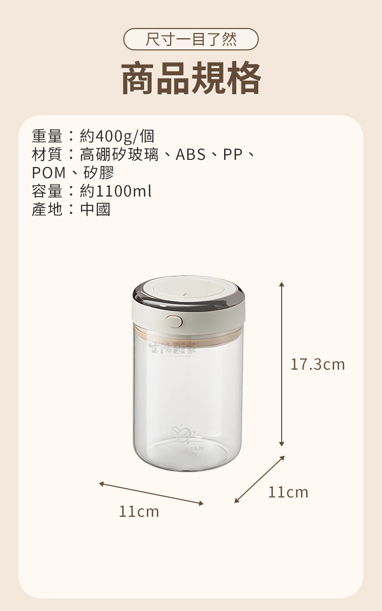 商品規格:1.尺寸:約寬11*深11*高17.3cm2.容量:1100ml3.材質:高硼矽玻璃、ABS、PP、POM、矽膠4.重量:約400g/入5.產地:中國6.商品:咖啡豆真空密封罐收納罐 1100ml*1※商品為人工丈量略有誤差,請以實品為準。※網頁圖片因拍攝關係或螢幕設定不同而會與實際商品略有色差,請以實際收到商品為準。