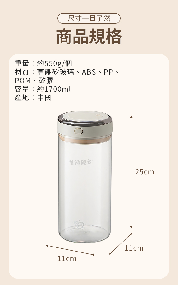 商品規格:1.尺寸:約寬11*深11*高25cm2.容量:約1700ml3.材質:高硼矽玻璃、ABS、PP、POM、矽膠4.重量:約550g/入5.產地:中國6.商品:咖啡豆真空密封罐收納罐 1700ml*1※商品為人工丈量略有誤差,請以實品為準。※網頁圖片因拍攝關係或螢幕設定不同而會與實際商品略有色差,請以實際收到商品為準。