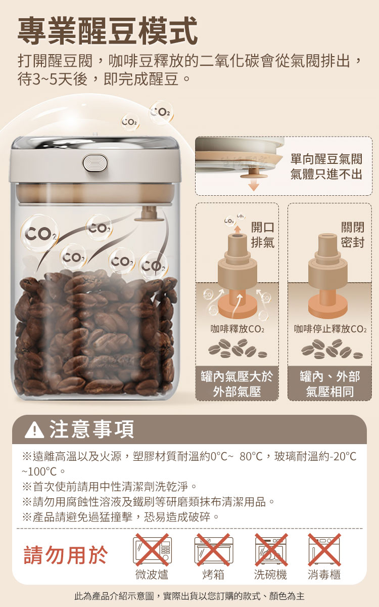 我每天都能喝到新鮮的好咖啡!☕💕以前總覺得家裡的咖啡豆放久了就會變味,明明剛買的時候香氣濃郁,沖泡出來卻總是少了點層次感而風味變得苦澀又不均勻。後來才知道,咖啡豆烘焙後會釋放二氧化碳,如果沒有好好醒豆或密封,香氣和風味都會流失!😱 自從入手這款會呼吸的「咖啡豆真空密封罐」,我的咖啡體驗真的完全升級了!☕ 貼心醒豆模式,讓咖啡風味更迷人!密封罐有醒豆閥,只要打開它,就能讓咖啡豆自然排出二氧化碳,3~5天後醒豆完成,香氣更濃,味道更圓潤順口! 每天沖泡時,光是聞到那股濃郁的咖啡香,就覺得超幸福!😍🔒 一鍵密封,完美鎖住新鮮!醒豆完成後,只要按下密封鍵,就能排出氣氣,罐內瞬間變成密封狀態,防潮又防氧化。以前遇到梅雨季節,咖啡豆很容易受潮變味,但這款密封罐完全沒有這個問題,每次沖泡都像剛開封的新鮮感!✨📅 內建日期轉盤,不再忘記最佳賞味期!我有時候一次會買好幾包咖啡豆,存放太久就會忘記哪包是新鮮的,哪包該先喝。這款密封罐有日期轉盤,直接標記存放日期,現在沖咖啡時一目了然,不用擔心喝到放太久的豆子!🛡️ 密封防漏,倒置也不怕漏氣!蓋子搭配的矽膠密封圈很厚實,不管怎麼擺放都不會漏氣,密封效果超好!而且比起塑膠罐,高硼矽耐熱玻璃更安心,清洗時用熱水沖一沖就乾淨了,完全不殘留異味!🍪 一罐多用,咖啡、零食、茶葉通通收納!雖然我是為了咖啡豆買的,但後來發現它真的超萬用! 我用來裝茶葉、零食餅乾、五穀雜糧,甚至花茶、藥材、乾貨,防潮效果一樣完美!從醒豆到密封,每個細節都幫你顧好,讓每一杯咖啡都保持最純粹的香氣和風味!咖啡豆千萬別隨意存放,強力推薦這款會呼吸的「咖啡豆真空密封罐」,讓你每天都能享受最完美的咖啡時光!☕💖🌈 使用後你會發現~有了 CaféDeck 咖啡豆密封罐,你不必擔心咖啡豆受潮、變質、失去香氣。每天早晨打開罐子時,依舊能感受到剛烘焙般的濃郁香味,沖泡出的咖啡醇厚順口。它不僅是收納工具,更是 維持生活質感的小幫手,陪伴你每一杯幸福的咖啡時光。無論你是咖啡新手,還是講究細節的咖啡職人,這款 真空玻璃密封罐 都能讓你的咖啡體驗升級。現在就把它帶回家,讓你的咖啡日常更專業、更美好!☕✨👉 別再讓咖啡豆香氣白白流失,立即入手 CaféDeck 咖啡豆真空玻璃密封罐!#咖啡豆保存 #真空密封罐 #咖啡生活 #精品咖啡器具 #收納美學📣 FAQ (常見問答)Q1:咖啡豆可以放多久?A1:一般建議在1個月內飲用完畢,搭配本密封罐能有效延長鮮度。Q2:可以放茶葉或零食嗎?A2:可以,本罐具備防潮密封設計,茶葉、花茶、五穀雜糧、零食都適用。Q3:玻璃罐耐熱嗎?A3:採用高硼矽玻璃,可耐高溫100℃與低溫-20℃,安全耐用。Q4:如何操作醒豆模式?A4:只需打開氣閥,讓咖啡豆釋放二氧化碳,3~5天即可完成醒豆。Q5:罐子可以放進洗碗機清洗嗎?A5:建議以中性清潔劑手洗,避免強烈碰撞以延長使用壽命。注意事項:1.請勿靠近高溫火源,避免玻璃破裂。2.清洗時建議使用中性清潔劑與柔軟海綿,避免刮傷。3.不可使用於微波爐、烤箱、洗碗機與消毒機。4.使用時避免劇烈碰撞或摔落,以免玻璃破碎。5.初次使用請徹底清洗並擦乾後再放入食材。