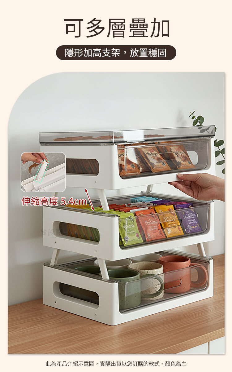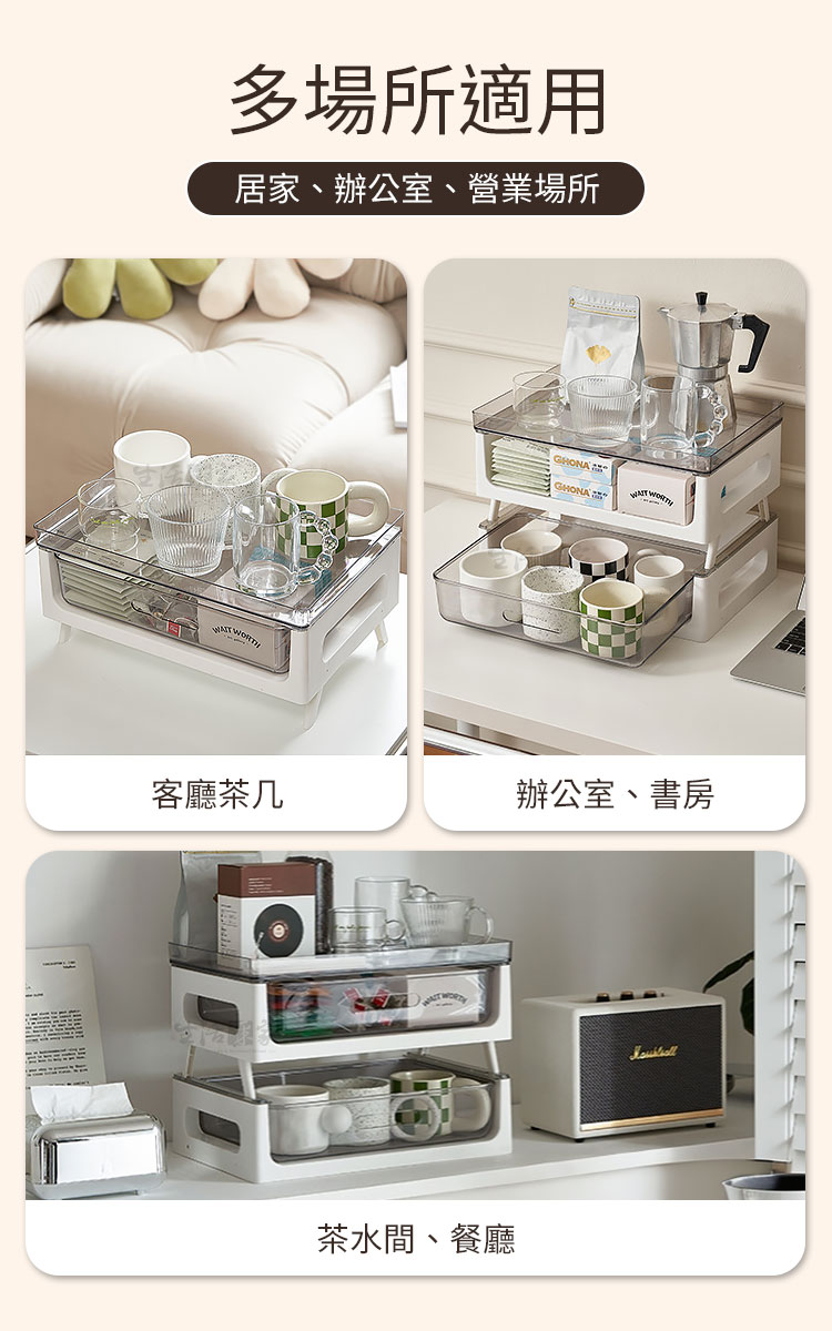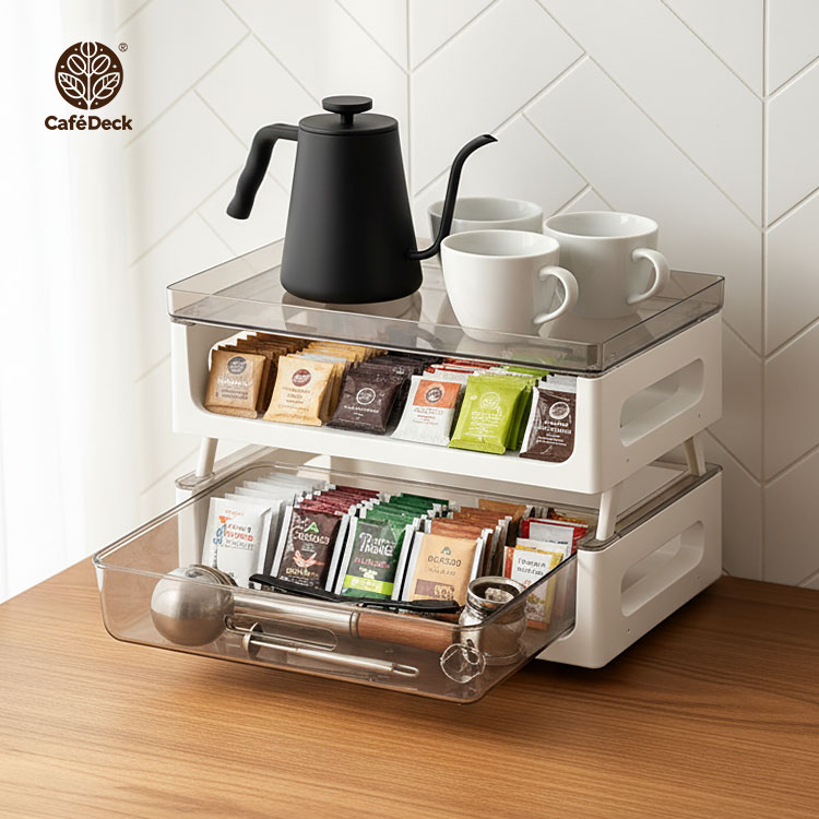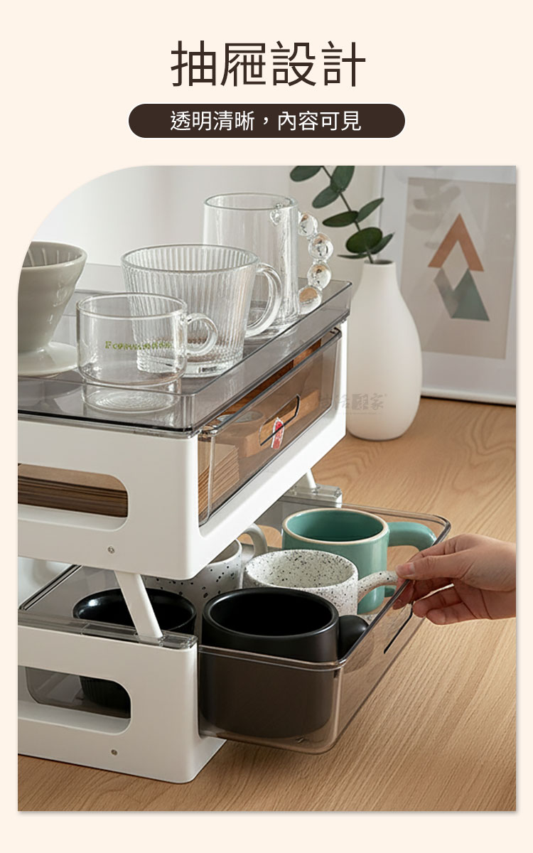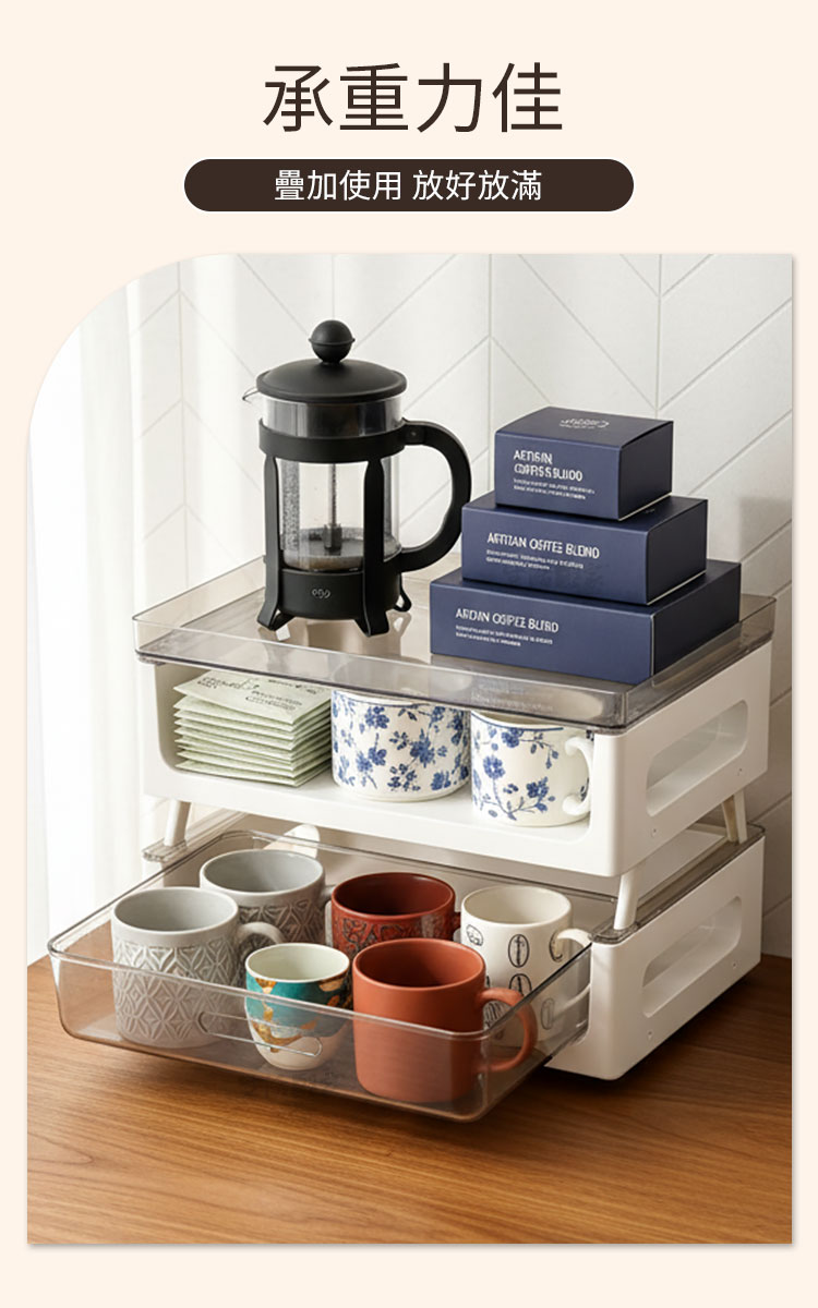 你的咖啡時光,更有秩序早晨的第一杯咖啡☕,從打開整齊的收納架開始。CaféDeck「咖啡茶包雙層置物架」,以簡約北歐設計結合實用機能,讓每一個沖泡瞬間,都成為生活的儀式感。✅ 雙層抽屜設計 — 透明抽屜清晰可視,茶包、咖啡膠囊、器具分類收納,一拉即取。✅ 可疊加多層架構 — 可靈活增減層數,支架高度可調,從小型桌面到茶水間都能完美適配。✅ 穩固承重結構 — 高強度PP+PET材質製成,承重力優異,上層可放咖啡壺、馬克杯或濾杯不晃動。✅ 居家與商用皆宜 — 適合客廳、辦公室、咖啡角、會議室等場域,讓桌面乾淨又具質感。✅ 可作展示架使用 — 放置茶包、甜點、沖泡包等,打造整齊又誘人的飲品展示區。🌟 使用後你會發現~☕ 茶包不再散亂,分類收納更快速。🏠 桌面整潔、視覺清爽,空間倍增。🪄 每一次沖泡,都像是精品咖啡館的儀式。💼 無論居家、辦公或商用,皆能輕鬆搭配不同場域。這不僅是一個收納架,更是一種生活態度——讓你的咖啡角,從凌亂變成美學角落。別等下一次整理才後悔!現在就讓 CaféDeck 咖啡茶包雙層置物架,為你的沖泡日常開啟全新層次💫#CaféDeck #咖啡收納架 #茶包整理 #北歐風家居 #生活儀式感📣FAQ (常見問答)Q1:抽屜能放哪些物品?A1:可放茶包、咖啡膠囊、濾紙、攪拌棒、湯匙、小杯子等,容量可容納A4尺寸。Q2:可以加層使用嗎?A2:可以,本產品支架設計可疊加使用,穩固不滑動。Q3:上層能承重多少?A3:可穩定放置約3~5公斤物品,如咖啡壺、馬克杯或小電熱壺。Q4:清潔方式是什麼?A4:可用濕布擦拭或清水清洗後自然晾乾,避免使用強酸鹼清潔劑。Q5:適合放在哪些地方?A5:適用於客廳、廚房、餐廳、茶水間、書房及辦公桌面。注意事項:1.請避免高溫火源處擺放,防止塑料變形。2.使用前確認抽屜滑軌方向,確保順暢抽取。3.疊加時請確實卡入支架槽,保持穩固。4.清潔後請完全晾乾再組裝,以延長使用壽命。5.若長期放置液體容器,建議加上防水墊。