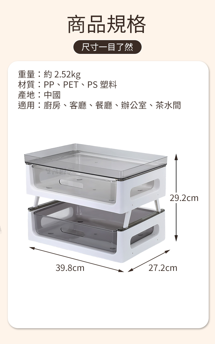 商品規格:1.尺寸:約寬39.8*深27.2*高29.2cm(疊加時)2.材質:PP、PET、PS塑料3.重量:約2.52kg/組4.產地:中國5.顏色:白色6.適用:廚房、客廳、餐廳、辦公室、茶水間※商品為人工丈量略有誤差,請以實品為準。※網頁圖片因拍攝關係或螢幕設定不同而會與實際商品略有色差,請以實際收到商品為準。