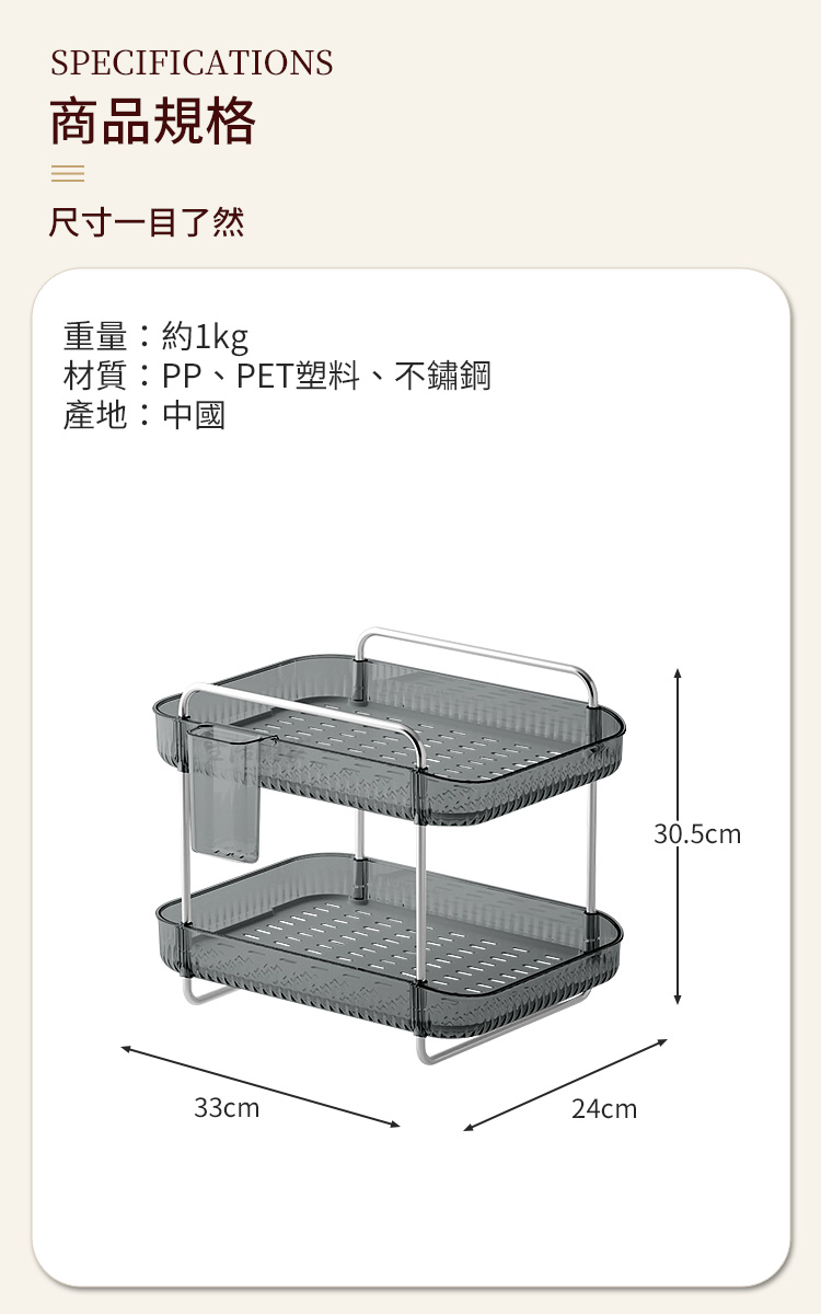 商品規格:1.尺寸:約長33*寬24*高30.5cm2.材質:PP、PET塑料、不鏽鋼3.重量:1kg4.產地:中國5.顏色:透明黑6.商品:桌面雙層瀝水收納置物架*1※商品為人工丈量略有誤差,請以實品為準。※網頁圖片因拍攝關係或螢幕設定不同而會與實際商品略有色差,請以實際收到商品為準。