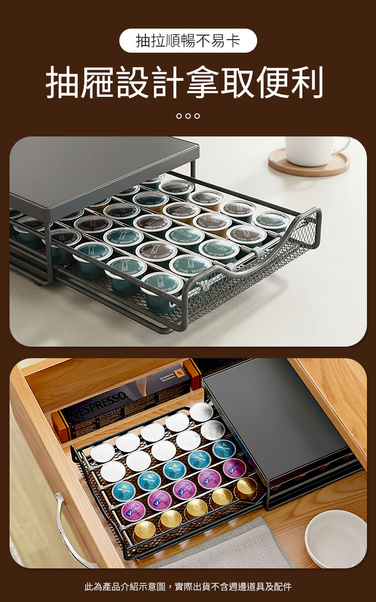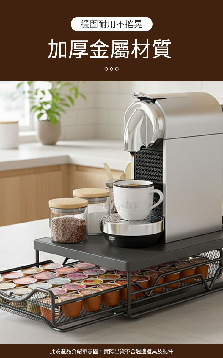 CaféDeck 咖啡膠囊收納抽屜架讓你的每日咖啡時光,更有條理、更具儀式感。在家沖泡一杯咖啡,不只是享受香氣的片刻,更是整理思緒的時光。CaféDeck 將這份「生活的秩序感」帶進你的咖啡角,一體式金屬收納設計,讓咖啡機與膠囊完美整合,既美觀又節省空間。✅ 大容量設計:抽屜式層架最多可收納約 50 顆咖啡膠囊,分類清晰,一眼取用。✅ 加厚金屬材質:採用碳鋼烤漆結構,穩固耐重,長時間使用不變形。✅ 滑順抽屜軌道:滑軌順暢不卡頓,取放膠囊更輕鬆。✅ 間距可調設計:內部可調支架,適用各式不同尺寸膠囊(Nespresso、星巴克等皆可)。✅ 防滑腳墊設計:抽屜拉取時穩定不移位,使用更安心。🌿 使用後你會發現~你的咖啡角變得更整潔、桌面更有質感。早晨泡咖啡時,再也不用翻找膠囊,一拉就取。午後靜謐時光,CaféDeck 為你留住那份慢生活的美好。它不只是咖啡收納,更是一種生活美學的延伸。👉 如果你也是喜歡喝咖啡、追求生活質感的你,這款「CaféDeck 咖啡膠囊收納架」將成為你每日最實用的小角落夥伴。立即收藏,打造屬於你的理想咖啡角!☕#咖啡收納方法 #CaféDeck #咖啡角佈置 #咖啡控必備 #質感生活📣 FAQ (常見問答)Q1:可以放哪些品牌的咖啡膠囊?A1:本架適用市售主流品牌(如 Nespresso、星巴克、illy 等),內部間距可調整。Q2:可承重多少?放咖啡機會不會晃?A2:採加厚碳鋼材質,承重約10公斤,放置家用咖啡機穩固不搖晃。Q3:抽屜會卡嗎?好拉嗎?A3:抽屜滑軌經特殊設計,滑順不卡頓,輕鬆拉取不費力。Q4:需要自行組裝嗎?A4:出貨為整體結構,無需組裝,開箱即可使用。Q5:可以放進櫃子或抽屜裡使用嗎?A5:可以!尺寸約 40×20×7cm,輕巧可放入廚櫃或檯面空間內。注意事項:1.本產品不含咖啡機與膠囊,僅販售收納架本體。2.請放置於平穩檯面上,避免傾斜導致滑動。3.清潔時以乾布或微濕布擦拭,請勿使用腐蝕性清潔劑。4.使用時避免重壓或撞擊,以維持結構穩定。5.本產品為金屬烤漆製,請避免長期接觸水氣或油污。商品規格:1.尺寸:約寬20*深40*高7cm2.材質:碳鋼+烤漆3.重量:約1.4kg/組4.產地:中國5.顏色:黑色6.收納:咖啡用品、咖啡膠囊、茶包、刀叉匙筷等7.適用:廚房、櫥櫃、吧檯、辦公室、茶水間等※商品為人工丈量略有誤差,請以實品為準。※網頁圖片因拍攝關係或螢幕設定不同而會與實際商品略有色差,請以實際收到商品為準。