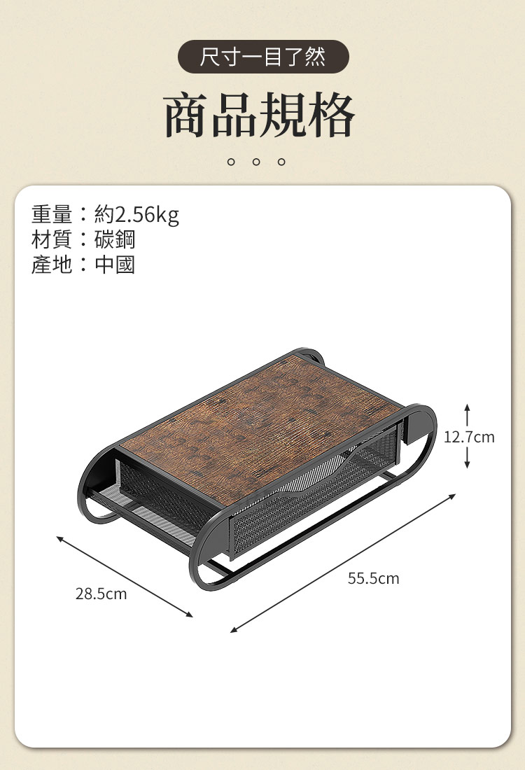 CaféDeck 咖啡茶包抽屜置物架 鐵木質感款|大容量整齊收納+穩固承重+免組裝設計想要讓咖啡角落更整潔、更有質感嗎?☕CaféDeck 鐵木款抽屜置物架,結合鐵藝框架與木紋檯面,不僅能承重咖啡機、烤麵包機,更能輕鬆收納咖啡膠囊、茶包、糖包,讓您的居家或辦公空間瞬間變得乾淨俐落。👉 抽屜式設計|分類整齊不凌亂大容量抽屜可放置咖啡膠囊、茶包、小零食,推拉順暢,收納一目了然。👉 鐵木結合|穩固承重不晃動碳鋼材質+仿舊木紋檯面,可承重高達 30kg,小家電擺放穩固安全。👉 多場景應用|廚房、辦公、咖啡角落皆宜不僅能作為咖啡茶具收納架,也可擺放印表機、文具、音響等,靈活多用。👉 質感設計|簡約百搭美學鐵木搭配黑色曲線框架,提升空間氛圍,打造質感生活角落。🌈 使用後你會發現~✔ 桌面不再雜亂,咖啡角落秒變質感小天地✔ 泡咖啡、泡茶時,茶包糖包伸手即取,更高效率✔ 提升空間利用率,廚房、辦公室都能享受整齊清爽✔ 兼具 收納+承重+美感,一架多用,物超所值如果您正在煩惱咖啡茶具總是散落在桌面上,或者小家電沒有合適的收納空間,那麼 CaféDeck 鐵木款抽屜收納架 正是您需要的答案!✨立即入手,讓您的生活空間更整潔、更有質感。#咖啡角落收納 #茶包抽屜置物架 #鐵木收納架 #桌面整理神器 #CaféDeck📣 FAQ (常見問答)Q1:請問收納架可以承重多少?A1:此款可承重高達 30kg,咖啡機、烤麵包機等小家電都能穩固擺放。Q2:抽屜可以放多少咖啡膠囊或茶包?A2:抽屜為大容量設計,可放置 50~70 個膠囊或茶包,分類整齊好取用。Q3:需要自行組裝嗎?A3:是的,需要自行組裝,內附說明書及零件,組裝不困難哦。Q4:除了咖啡茶具,還能收納什麼?A4:可用於收納文具、零食、印表機列印紙、餐具等,多用途應用。Q5:材質會不會容易生鏽?A5:採用碳鋼烤漆工藝,耐用防潮,正常使用環境下不易生鏽。注意事項:1.請避免長時間放置於潮濕環境,以延長使用壽命。2.承重雖達 30kg,但建議均勻受力,避免單點過重。3.請勿使用尖銳物品刮磨表面,以免影響美觀與防護層。4.商品示意圖僅供參考,出貨不含咖啡機、茶具等配件。5.建議定期清潔,以保持檯面與抽屜整潔衛生。6.商品內附組裝說明書,請組裝無誤後再使用。7.鐵木為天然木材,每片紋路會都會不同,無法指定紋路。