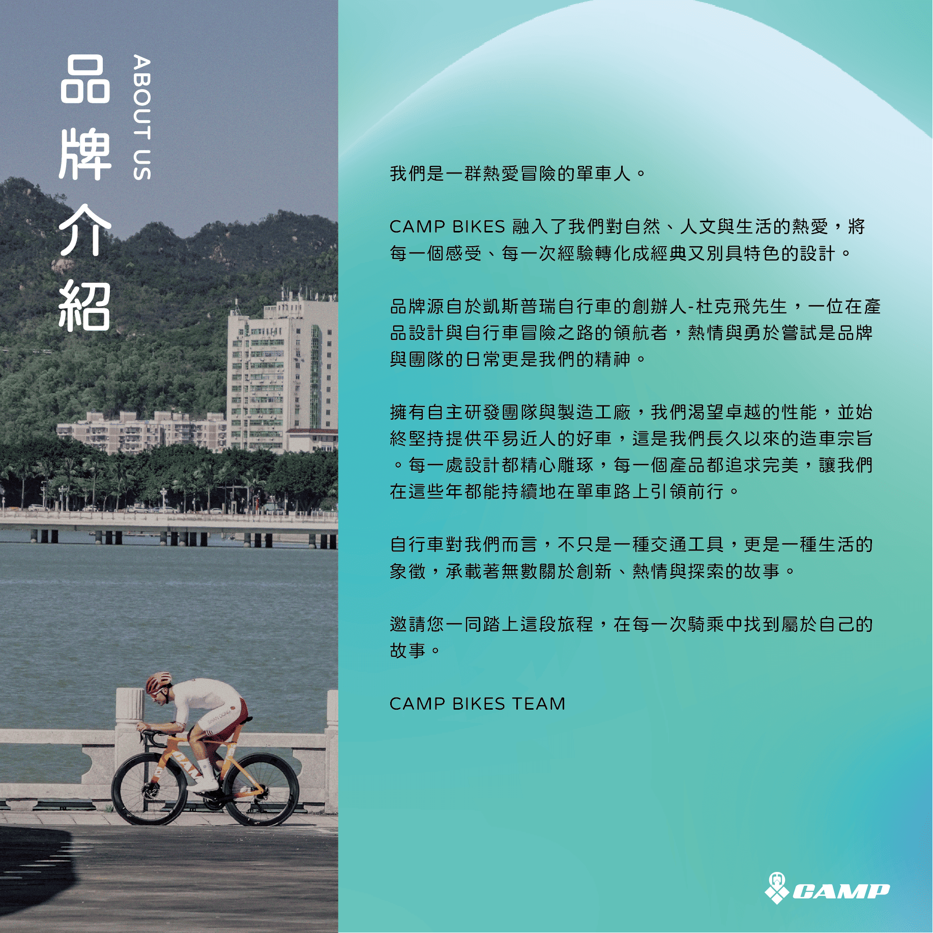 座管:CAMP T800 碳纖維空力座管坐墊:SR 競技人體工學碳弓坐墊車把:CAMP T800 碳纖維全內走線一體把