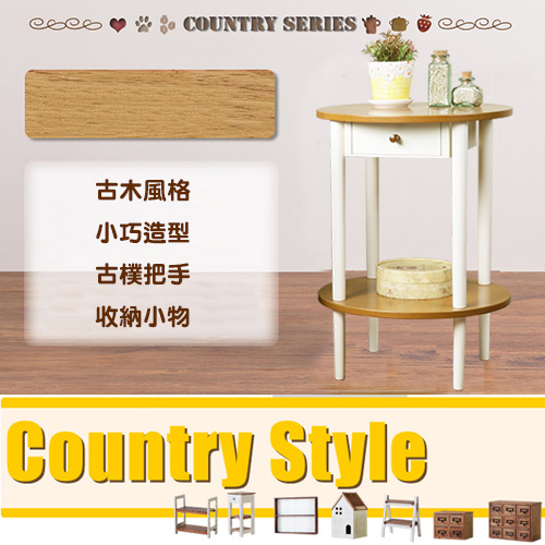 源於自然的品味生活,風靡歐美日韓的古木系列家具讓您回到最初的自然與散發獨特氣息的風格,反璞歸真的感動,沒有多餘的贅飾,回味鄉村情懷,值得您收藏! 古木或仿古木系列產品,主體支柱採用實木並搭配桌板與層板表面的清新木紋,講究追求鄉村風格的白色以及原木色系配色處理,洋溢自然鄉村風情! 《鄉村趣》古木調圓形茶几邊桌,沒有任何銳角沒有碰撞危險的圓形桌面,可愛小巧造型適合放置於沙發或者床邊當成側邊茶几桌使用,上面有一個收納的小抽屜,收納文具、筆記本、乳液等小物非常適合,下方則有一個圓形置物層板,只要在天板鋪起一片優雅小方巾,擺放盆栽來裝飾,您的居家質感立即提升,是喜愛鄉村風格的您最佳的選擇!