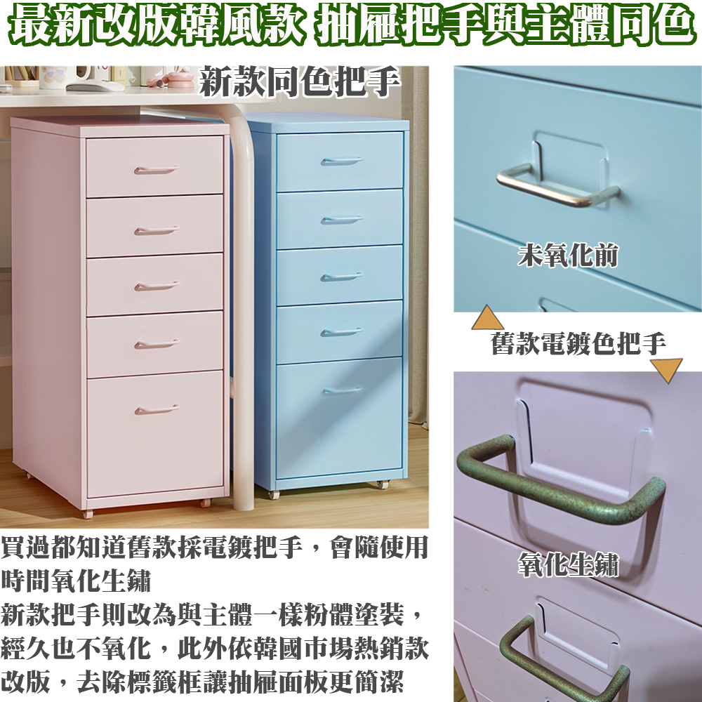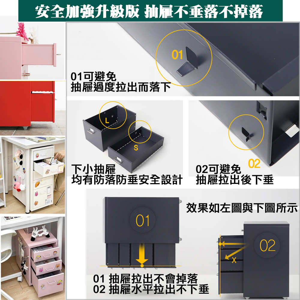 ★最新款式~主體與把手同色搶先上市,更具簡潔韓系風格,解決舊款電鍍把手生鏽問題★★極簡炫彩風格實用抽屜櫃~臥室、床頭、書房、廚房、客廳、陽台、辦公室等皆合用新款式新顏色新設計,增加韓風色系以及安全配備且完全不加價,每個抽屜皆有兩個卡扣設計,拉出抽屜時不會因操作不慎而讓抽屜落下,也不會因拉出一半抽屜即下傾,不掉落不下垂,更加安全且貼心好用。您時常為了收納帳單、合約、成績單、獎狀、證照、遙控器或DM等而頭疼不已嗎,除了塑膠收納的文件櫃以外您有更時尚的選擇!《C&B》鋼鐵斯特附輪五抽屜櫃,是外銷歐美日韓的暢銷商品,採用0.5mm優質冷軋鋼板,外表輔以先進健康環保的粉體處理,無毒無甲醛,作工精緻穩固耐用。一大四小抽屜的設計,收納量大,能容納A4尺寸的物品,可依需求收納在大抽屜或小抽屜內。底下附有四個活動滾輪,方便您隨心所欲的移動到需要使用的地方,文件櫃、收納櫃、工具櫃、床頭櫃、側邊櫃都很適合。■商品規格 尺寸 : 約(寬)28x(深)41x(高)69 公分(包度包含輪子,若不安裝輪子為67公分) 抽屜內寸 : 大抽屜 : 23 x 37 x 19 cm 小抽屜 : 23 x 37 x 9 cm 主要材質 : 冷軋鋼鐵板 ■注意事項 1.本商品附詳細組裝說明書,需DIY自行組裝。 2.DIY商品經組裝後恕不接受退貨,請先確認商品是否符合要求。 3.商品圖檔顏色因電腦螢幕設定差異會略有不同,請以收到的實際商品顏色為準。 4.若需退貨,請保持商品及包裝之完整性,無法回復原出貨之完整包裝恕不接受退換貨。 5.送達地點有否限制:限本島,外島須外加運費。我們將事先與消費者聯繫報價,議定外島運費後,訂單始成立。 6.本島偏遠地區接單說明:物流業者定義之本島偏遠地區接單須另加聯運費。我們將事先與消費者聯繫報價,議定聯運費後,訂單始成立。 7.鑑賞期限制說明:溫馨提醒,鑑賞期非試用期, 敬請確認商品無瑕庛問題並確認購買後再使用。 8.收到貨品時,要將外箱保留至鑑賞期結束,不要讓貨運公司將外箱帶走,換貨時換貨商品必須是全新狀態(不得有刮傷),並有完整的包裝,包含外紙箱、配件紙箱、保麗龍、保護袋、贈品等所有附隨文件或資料之完整性。 9.偏遠地區概略表:以下地區為物流公司定義之偏遠地區概略(實際以貨運公司定義為準)。 (1).新竹:尖石鄉、五峰鄉 (2).苗栗:泰安鄉 (3).台中:梨山、谷關、環山、和平鄉 (4).南投:鹿谷鄉、信義鄉、仁愛鄉 (5).雲林:古坑鄉 (6).嘉義:阿里山鄉、梅山鄉、嘉義農場 (7).高雄:內門鄉、杉林鄉、甲仙鄉、六龜鄉、甲仙鄉(小林村)、六龜鄉(寶來村) (8).屏東:霧台鄉、春日鄉、泰武鄉、三地門鄉 (9).宜蘭:大同鄉、南澳鄉 (10).花蓮:秀林鄉、池上鄉、海端鄉 (11).台東:長濱鄉、東河鄉(北源村)、台東地區(牧場&監獄)