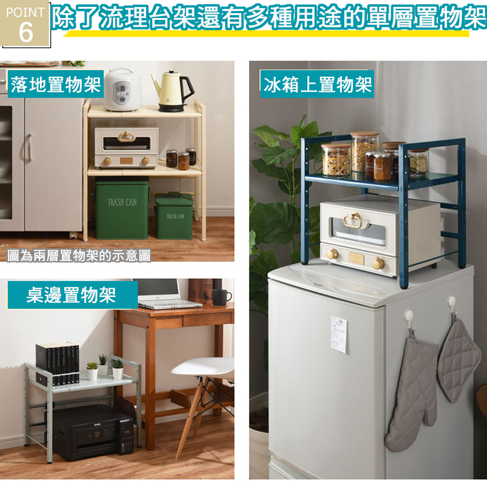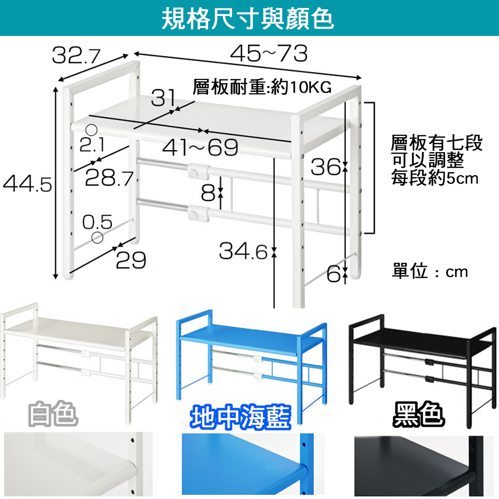 ★台灣生產日本熱銷!超級好用單層伸縮收納層架,可創造兩層收納的立體空間!★水波爐、氣炸桌、生機調理機、麵包機......一直推陳出新的廚房家電用品看起來都很好用,想入手卻怕無處收納嗎? 藍芽設配、3C用品圍繞在您的桌面,但總覺得書桌太小空間有限?那麼您一定需要這個《C&B》元森桌上流理台上伸縮單層置物架,它既不會佔去您太多的空間,又能讓您的流理檯面或桌面多了延伸空間,讓平面頓時變成立體的兩層空間,所有的東西,依使用率、體積,分別放置,一目了然、取用方便,節省空間,再也不怕空間不夠或找不到東西的窘境了!《C&B》元森桌上流理台上伸縮單層置物架,是一組具有一個層板的伸縮置物收納架,總寬度可從45公分~73公分之間伸縮、可依您的需要、桌面或檯面的大小來調整使用,層板的高度則有7段的高度可以選擇,可依您放置的物品大小來調整層板高度,宛如量身訂做一樣適合您的各種使用需求。台灣生產外銷日本好品質,結構穩固耐用,粉體塗裝耐刮耐鏽又防潑水,當調整寬度時鐵管上壓有警告線避免您調整到過寬而垮下,底部調整腳墊設計因可微調高度也能避免放置處的檯面或地面不平,加上輕鬆按壓即可固定住的調整旋鈕,調整寬度不費力,日式貼心與安心家具的設計發揮到極致。■商品規格尺寸 : 約(W)45~73*(D)32.7*(H)44.5cm耐重 : 層板約10KG、角管約5KG、圓管約1KG主要材質 : 鐵板、鐵管重量 : 約4KG產地 : 台灣■注意事項1.本商品附詳細組裝說明書,需DIY自行組裝。2.DIY商品經組裝後恕不接受退貨,請先確認商品是否符合要求。3.商品圖檔顏色因電腦螢幕設定差異會略有不同,請以收到的實際商品顏色為準。4.若需退貨,請保持商品及包裝之完整性,無法回復原出貨之完整包裝恕不接受退換貨。5.送達地點有否限制:限本島,外島須外加運費。我們將事先與消費者聯繫報價,議定外島運費後,訂單始成立。6.本島偏遠地區接單說明:物流業者定義之本島偏遠地區接單須另加聯運費。我們將事先與消費者聯繫報價,議定聯運費後,訂單始成立。7.鑑賞期限制說明:溫馨提醒,鑑賞期非試用期, 敬請確認商品無瑕庛問題並確認購買後再使用。8.收到貨品時,要將外箱保留至鑑賞期結束,不要讓貨運公司將外箱帶走,換貨時換貨商品必須是全新狀態(不得有刮傷),並有完整的包裝,包含外紙箱、配件紙箱、保麗龍、保護袋、贈品等所有附隨文件或資料之完整性。9.偏遠地區概略表:以下地區為物流公司定義之偏遠地區概略(實際以貨運公司定義為準)。(1).新竹:尖石鄉、五峰鄉 (2).苗栗:泰安鄉 (3).台中:梨山、谷關、環山、和平鄉 (4).南投:鹿谷鄉、信義鄉、仁愛鄉 (5).雲林:古坑鄉 (6).嘉義:阿里山鄉、梅山鄉、嘉義農場 (7).高雄:內門鄉、杉林鄉、甲仙鄉、六龜鄉、甲仙鄉(小林村)、六龜鄉(寶來村) (8).屏東:霧台鄉、春日鄉、泰武鄉、三地門鄉 (9).宜蘭:大同鄉、南澳鄉 (10).花蓮:秀林鄉、池上鄉、海端鄉 (11).台東:長濱鄉、東河鄉(北源村)、台東地區(牧場&監獄)
