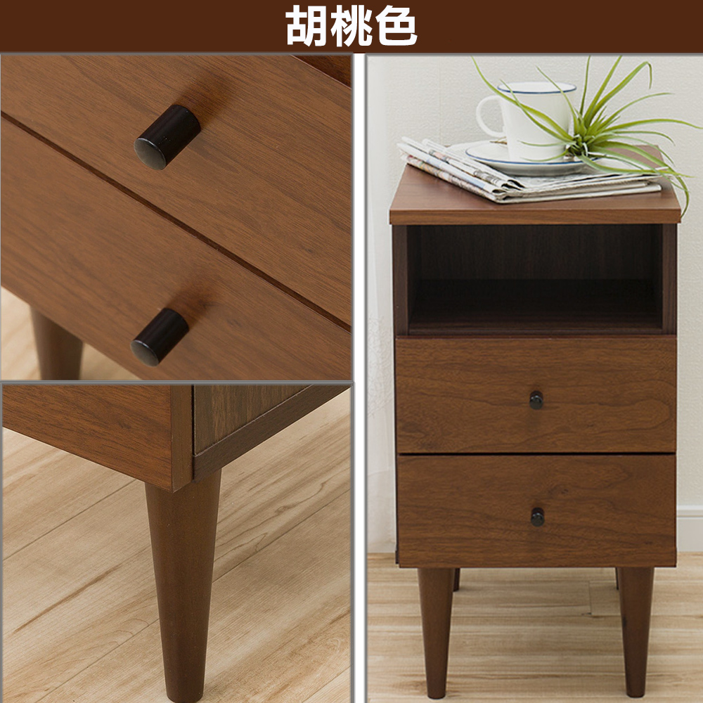 《代代木》和風實用收納床邊櫃,櫃腳的造型有濃厚的伊姆斯風格,將結構、功能、心理、美學等元素貫穿於產品設計的各個方面,洋溢著現代、簡約的氣息!《代代木》和風實用收納床邊櫃,是台灣生產外銷日本的商品,天板與抽屜面板皆使用高密度纖維板材質,外表再貼覆實木泊片,外觀看起來與實木無異,在環保意識高漲的今日日本,砍樹而生產的實木家具已經不再受歡迎,替代性材質是對地球友善的表現,兼具質感與愛護樹木是《代代木》和風實用收納床邊櫃的設計理念!櫃腳以北歐風格伊姆斯的外形設計,結構強韌耐久性佳,天然的實木紋路,細緻的表面加工,櫃腳底下與地面接觸處有防滑的絨布貼片的貼心設計,保護您的地板!《代代木》和風實用收納床邊櫃,靈巧不占空間卻有多種機能,天板後方為可動式天板設計,內部收納空間當成雜誌收納架,能夠收納您隨手閱讀過的報章雜誌,將延長線放入且背後有配線孔的貼心設計,更方便您在櫃子上放置家電或充電器等物品! 此外也設計有兩個收納抽屜,讓本商品就像個百寶櫃一樣收納力驚人,把它當成床頭櫃、桌邊櫃、雜誌架等都很合適喔!《代代木》和風實用收納床邊櫃,共有胡桃木和白橡木兩色可選,居家的空間裡擺設此收納櫃,增加了和風的氛圍,這個優質好用又具設計感的收納櫃,也值得向您推薦!■商品規格 尺寸 : 約寬30×深41×高55公分 前開放式收納空間:寬26.5x深24x高11.5公分 後收納格:寬26.5x深11x高35.5公分 上抽屜內寸:寬23x深22.5x高7.5公分 下抽屜內寸:寬23x深22.5x高9公分 材質:櫃腳:實木 天板、抽屜面板:MDF板貼胡桃木實木皮或白橡木實木皮 櫃體:MDF板貼化妝紙 產地 : 台灣 ■注意事項 1.不需DIY,打開紙箱後僅需旋上四個櫃腳即可使用。 2.若需退貨,請保持商品及包裝之完整性,無法回復原出貨之完整包裝恕不接受退換貨。 3.送達地點有否限制:限本島,外島須外加運費。我們將事先與消費者聯繫報價,議定外島運費後,訂單始成立。 4.本島偏遠地區接單說明:本島的偏遠地區接單須另加聯運費。我們將事先與消費者聯繫報價,議定聯運費後,訂單始成立。 5.鑑賞期限制說明:溫馨提醒,鑑賞期非試用期, 敬請確認商品無瑕庛問題並確認購買後再使用。 6.收到貨品時,要將外箱保留至鑑賞期結束,不要讓貨運公司將外箱帶走,換貨時換貨商品必須是全新狀態(不得有刮傷),並有完整的包裝,包含外紙箱、配件紙箱、保麗龍、保護袋、贈品等所有附隨文件或資料之完整性。